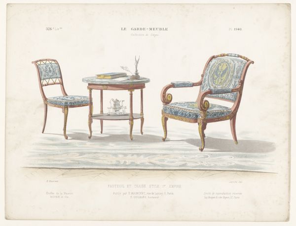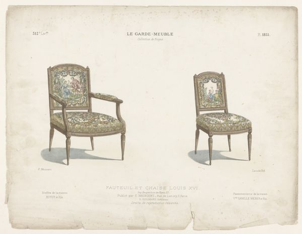 Editor: This is “Fauteuil en stoel” by Léon Laroche, made sometime between 1895 and 1935. It looks like a study of chair designs, perhaps for a furniture maker? I’m struck by the delicacy of the line work, especially in rendering the fabric. What stands out to you in this piece? Curator: It’s like stumbling upon a forgotten page from someone's design journal, isn't it? These chairs, floating on the aged paper, seem to whisper tales of salons and whispered conversations. I’m drawn to the almost ghostly presence of the objects, as if they are echoes rather than solid forms. Do you notice the implied prices? Perhaps these are catalogue drawings. The almost scientific detachment mixed with the undeniable elegance. It's like looking at a butterfly pinned in a display case—beautiful but removed from its natural context. Makes you wonder about the person who sketched them. Editor: That's a wonderful image! A butterfly, pinned. It does feel very detached. Almost like a study. But there’s definitely elegance there. I see the implied prices now, yes that moves it into catalogue territory. The scientific mixed with the artistic makes it intriguing. Was this common for design at the time? Curator: I think so, the intersection of industry and art. It makes me consider craft in the rise of industrial reproducibility, and that constant struggle between handmade and mass-produced objects... Which voice gets heard? Is this capturing or killing a moment? What do you think about that duality? Editor: It is a really good question to ponder! Especially within the timeframe it was created. It certainly gives the work another, more complex layer to think about. I initially saw it very simply, but now I can see so much more. Curator: Wonderful, isn't it? A humble sketch, quietly provoking thoughts about the soul of creation and mass production. It’s as if those chairs are still waiting to be built, existing in the potential of line and form. And perhaps, in our imaginations, they finally take shape.