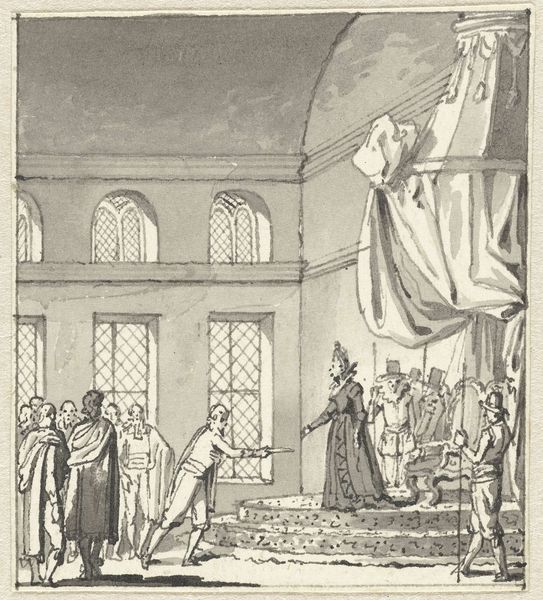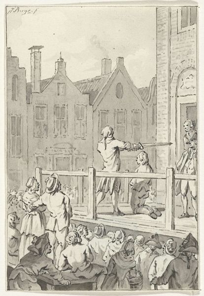 Curator: Look at this snapshot of history! This is a drawing by Jacobus Buys, titled "Afhalen bij patriotten te Zutphen van trommels en vaandels, 1787," which roughly translates to "Taking drums and banners from patriots in Zutphen, 1787." It was created around 1796. Editor: Oh, the drama! It feels tense, like a frozen moment just before something chaotic happens. It’s all in grays, almost like a faded memory brought to life in ink. And the buildings in the background, looming over everything, give a real sense of weight, don't they? Curator: Precisely. Buys captured a pivotal moment during the Patriot Revolt, a time of political turmoil in the Netherlands. See the soldiers? They're seizing the symbols of the Patriot movement – drums and banners, basically their voice and identity. Editor: I get it. The forced surrender of these items becomes a visual metaphor for the silencing of dissent. I notice, the crowd isn’t necessarily rebellious either—a kind of fear in their posture maybe? And is that a dog, by the wheel? Curator: Good eye! That little boy trying to hold the wheel while that little rascal barks hints that daily life still unfolds even amid this political turmoil. Everyday life gets strangely twisted in historical conflict... . Editor: You're so right. It makes me think about how ordinary people are often caught in the crossfire of ideologies and power struggles. And, for the artist to select such an image…there's clearly a statement there, and perhaps a point of view? Curator: No doubt! Buys’ choice to depict this scene reveals his stance on the events—perhaps a commentary on the suppression of liberty, or even an endorsement of order. He used ink and engraving techniques to achieve these fine details in the rendering, giving it all an elevated gravitas! Editor: Well, this engraving certainly encapsulates the idea of visual culture and collective memory. Looking at how carefully each figure is illustrated makes you contemplate just how such visual documentation shapes our grasp on these historic milestones. Thanks for bringing this to life, literally, through description! Curator: The pleasure was all mine. Thinking about that day through Buys’ eyes just makes it even more...well, moving, really.