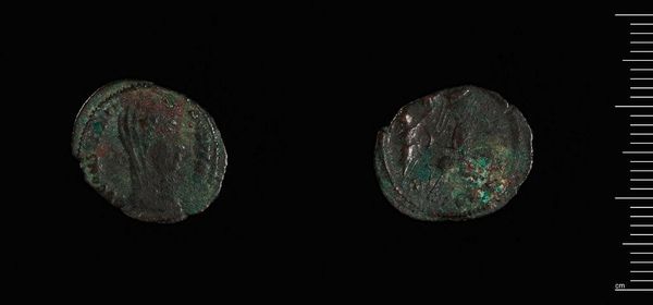 Curator: Here we have a coin from Laodikeia ad Mare, issued during the reign of Septimius Severus and his wife, Julia Domna. Editor: It has such a tactile quality, doesn’t it? The green patina gives it the appearance of being something reclaimed from the earth. Curator: Indeed, coins were not merely currency, but also potent symbols of imperial power and divine sanction. The images and inscriptions would have conveyed specific messages. Editor: Absolutely. These coins circulated within a society grappling with issues of identity, governance, and cultural exchange under Roman rule. Curator: It is a tiny object holding immense cultural meaning. Editor: I am left thinking about all the hands it passed through.