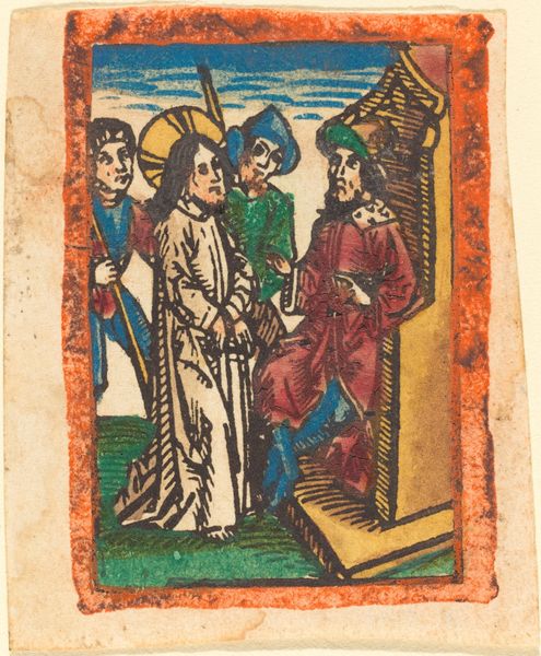 Curator: My first thought is how tender this piece is. Something about the pastel colors in such a monumental event. Like a dream almost. Editor: I agree, there is a delicate quality. This print, created with colored pencil, is titled "The Marriage of the Virgin" dating back to somewhere between 1480 and 1490, situated within the Italian Renaissance. And your comment about a dream touches upon a common theme from the period of idealizing the biblical figures portrayed in this work. Curator: Oh, idealizing indeed! Joseph's got such a sweet little sprig, the symbol of his worthiness to marry Mary. Makes me wonder if he showed up to the wedding super nervous, clutching that little plant! Editor: Absolutely. And the patriarchal implications are so explicit— the performative expectations of masculinity reflected in artistic form. And this act of “worthiness” reduces the voice of the woman, as the figure of the virgin is exchanged to an arranged marriage and her lack of agency within the religious order. It’s quite layered once we delve in! Curator: Layered indeed. And all those clean lines, even with the muted colors—makes it look almost like stained glass but accessible enough to touch, in a way that actual stained glass never could be. I can imagine how something like this could move you...how it was perhaps intended to move you back then. Editor: Yes, consider the role that materiality played in fostering devotional practices! I see these early prints as attempts to democratize art and make religious iconography more available and easily distributed in domestic settings. These prints could act as teaching aids or simply bring faith into homes with less of a divide between the clergy and lay believers. Curator: It is accessible—something that makes it all the more precious to hold in one’s hands, connecting you to the Renaissance period. It brings such a beautiful, small domestic scene of a woman's marriage that has evolved into something far more extensive in religious contexts. It makes you contemplate not only the sacred scene but what it represents and evolved into over time. Editor: Exactly! It serves as a visual testament of how far back these stories extend and it becomes a critical reflection to deconstruct the roots and social constructs embedded in our understanding and how that evolves throughout society. It becomes so multi-dimensional for our present world.