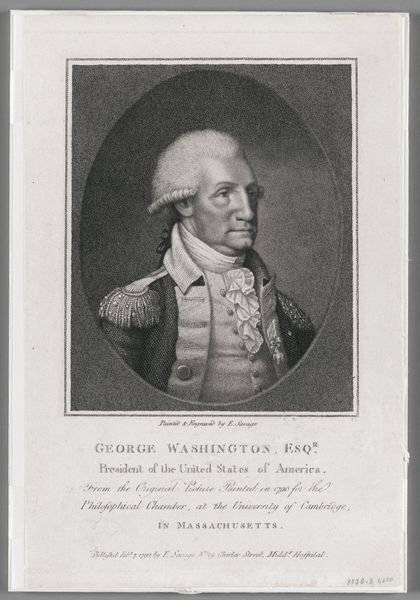 Curator: Oh, it's like looking into the soul of a nation's father figure. Kind of stern, but not without a hint of kindness in those eyes. It has that feeling of black and white photography. Editor: Indeed. This is "Panel of George Washington," painted between 1846 and 1883 by William P. Babcock. We can appreciate in it an exemplary demonstration of portraiture steeped in Neoclassical aesthetics. Look at the controlled monochrome palette—an exploration of tonal values used to render form and texture, adhering to academic principles. Curator: Academic, yes, that’s it! Like he's been frozen in a textbook. You can almost hear him reciting something about duty and honor. I do find that restricting oneself to this black and white is powerful and timeless. There's this amazing focus that grabs me by my shirt! Editor: The restricted palette certainly compels focus upon the figure itself. Observe the precise linear qualities defining Washington's features, framed within an oval that further accentuates the subject's gravitas and recalls the traditional form of portrait medallions. The use of this artistic language situates Washington very consciously within a narrative of virtue. Curator: The lighting is great, too. Stark. Almost feels like a spotlight on history. Makes you wonder what Babcock thought of Washington. Adoration? Distance? Is he just copying history? Editor: The chiaroscuro dramatically models his face and the ornate details of his uniform, directing our gaze, inviting a focused reading. The aesthetic echoes both reverence and a considered articulation of power. And I’d wager the neoclassical elements are no accident either. The era, like the man, was about order, civic virtue and tradition, something well documented with art history. Curator: So, overall it hits you right in the… civic duty. It is a bit overwhelming in a way. It speaks volumes in black and white. A lot. Editor: Absolutely, and that concentrated force creates an incredible object of historical, artistic, and political commentary.