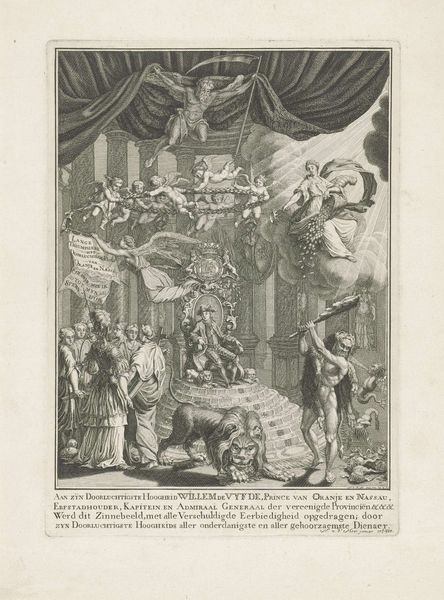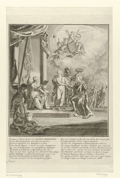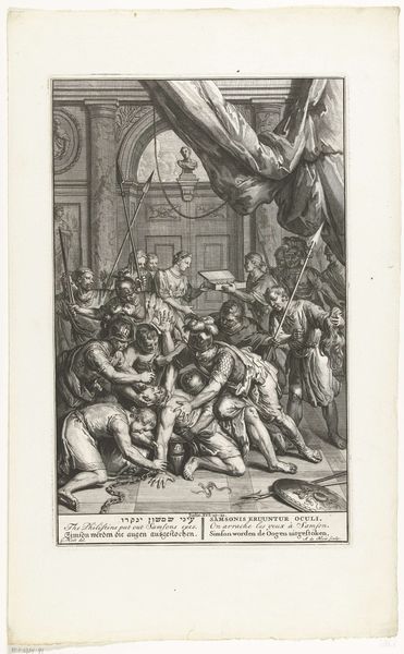 Curator: Joseph Mulder created this engraving, “Jozua en Eleazar delen het beloofde land uit”, sometime between 1720 and 1728. The scene depicts Joshua and Eleazar dividing the Promised Land. It’s quite intricate, isn't it? Editor: It feels… staged. Look at the arrangement of figures; it resembles a theater production, doesn’t it? The artificiality is hard to ignore, but perhaps fitting considering the topic of division and allocation of power. Curator: Yes, consider the symbolic implications. We see the figures of Joshua and Eleazar—pivotal figures of authority— overseeing the division. In this context, the lottery itself acts as a charged symbol, revealing divine intent in terrestrial matters. The blind casting is symbolic. Editor: Precisely. A lottery conceals its structures of power under the veil of chance and highlights the concept of manifest destiny at play, where some receive more privilege based on predetermined circumstances, reflecting the deeply ingrained structural inequities perpetuated in contemporary societies. Curator: Mulder seems preoccupied with representing not just the physical division of land but also the act of legitimizing it through visual means. Take a look at the map held up at the back of the room. Its mere presence cements a certain degree of officialdom, right? The symbolic implications are profound. Editor: Absolutely, the inclusion of that map, within the print, becomes an instrument—it asserts a dominant perspective that requires constant interrogation and critical analysis from modern audiences. It is, therefore, paramount for us to understand this depiction in relation to issues of colonialism, land rights, and the complex legacy of mapped territories that extends well beyond just biblical allegory. Curator: Viewing this through an iconographic lens, it is interesting how symbols of divine will, here manifesting in the lottery, get appropriated and translated over time in varied historical and cultural narratives to bolster ideas of destiny or cultural superiority. Editor: And while it’s important to be critical of how these narratives get presented, one might see some semblance to struggles for equality. This image opens up discussion about agency and the forces at work shaping historical movements for liberation and justice. Curator: Seeing it now through both lenses, it reminds us how history can inform not just how we see the past, but also how we understand present social conditions and our continued march towards progress. Editor: Indeed, grappling with visual depictions of past ideologies reminds us of our shared responsibility for creating a more just future, guided by deeper understanding.