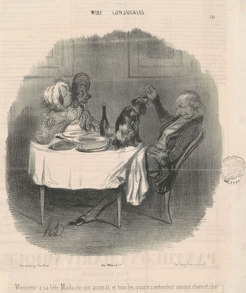 Curator: Isn't there something so profoundly melancholy about this 1843 watercolor by Edouard de Beaumont, titled "Karikatuur van twee dominospelende mannen"? It lives at the Rijksmuseum. Editor: Melancholy? It feels more like a snapshot of colonial-era industry. Look at the setting, the cramped quarters; it suggests a temporary shelter, a place of labor. And the men themselves, their roles defined not by leisure but by the material conditions of their existence, with their skin colors heavily represented. Curator: Yes, the racial aspect cannot be ignored. But look at the way de Beaumont renders their faces – the resigned smoker, the intently focused player, even the onlooker with a flicker of something… pity? The materials serve the expression. The aged, toned paper seems to seep into the scene, a wash of time and inevitability. It reminds me of old family albums, the weight of inherited history. Editor: I’m more struck by what the artist leaves out. We see no tools, no obvious signs of labor beyond these three men enclosed within a stark structure, what does that imply about production here? Is dominoes a way to make use of idle labor? It isn’t about high art, I don’t think. De Beaumont seems fascinated by documenting process; it isn't pure artistic exploration, or we would see brush strokes with different densities to create tonality, not simple washes. The lines around their clothes are simple and clear and they are merely there as placeholders to present a body that is hard at work, but where the production lies isn't clear. The watercolor functions almost as an anthropological study. Curator: An anthropological study with a touch of heartbreak, perhaps? I find the intimacy of the scene unsettling, knowing the power dynamics at play. It feels almost voyeuristic, catching them in this shared moment of… what, exactly? Boredom? Complicity? Resignation? And those suggestive lines… that little bag… could that be about to open us into another perspective entirely? Editor: Right, which also reflects back on Beaumont and the role he had at the time, observing them so plainly. One could not detach this art from its roots when contemplating colonial times. Look at their very hands and arms that were responsible for untold material labor! I am sure Beaumont's vision was never just about melancholy but capturing an ethos in order to relay information. Curator: Perhaps. I still sense a deep well of… yearning. Perhaps yearning for a world where this scene isn't so heavy, so freighted with implication. In a time before photography, perhaps drawing someone was about understanding and acknowledging the differences. And at a more human level, this scene transcends its historical moment. What have you made of it? Editor: We need to keep in mind that the value isn’t simply the surface-level emotion—but is in all that it reveals about the conditions of colonial society and that time period as the product of colonial systems that defined life then. The process reflects on so many processes.