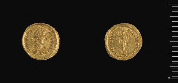 Curator: Here we have a gold coin, “Coin of Herakleios," attributed to Abd-al-Malik of the Umayyad Dynasty, a little piece of history weighing only 4.45 grams. Editor: It feels weighty somehow, like staring into a shimmering past. The color alone evokes warmth and power, doesn’t it? Curator: Indeed. The imagery includes figures and what appears to be a cross atop a stepped base, all executed with striking precision despite the coin's diminutive size. Editor: I find myself drawn to the wear and tear, the subtle flattening of details. It whispers of journeys, of hands exchanging it, a tangible connection to a bygone era. It's a humble, shining artifact. Curator: Absolutely, and thinking about the symbolic interplay of Byzantine and early Islamic imagery provides a fascinating look into cultural exchange at the time. Editor: It truly is a small object holding such large stories.