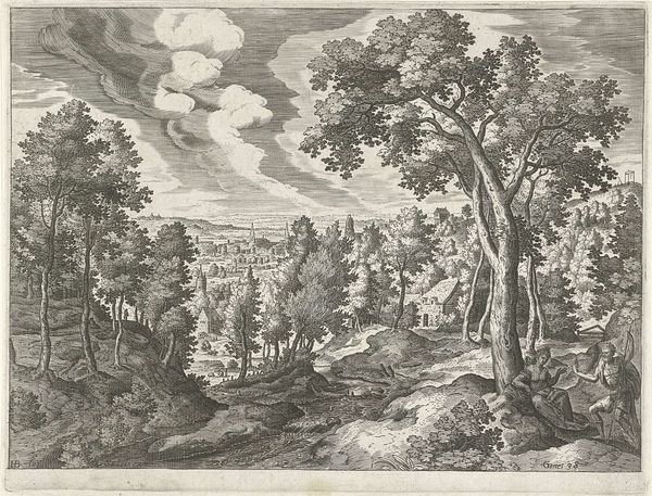 Johann Sadeler I created this engraving, "Landschap met de fabel van de vogelvanger en de slang," sometime between 1550 and 1601, a period marked by significant social and cultural shifts in Europe. This image is more than just a landscape; it's a narrative deeply rooted in the fables and moral teachings of the time. Sadeler uses the idyllic scenery as a backdrop for a cautionary tale about human folly and divine retribution. The fables depicted here reflect the era's preoccupation with morality, often cautioning against greed and hubris. The snake is symbolic, it represents the deceit and hidden dangers lurking beneath the surface of seemingly peaceful existence. Interestingly, the detailed depiction of the landscape, the town in the distance, and the people going about their daily lives, serves as a mirror to the society of Sadeler's time. It invites us to reflect on our own place within this landscape, and to consider the consequences of our actions. The emotional power of the artwork lies in its ability to evoke a sense of timelessness, reminding us that the human condition remains constant, even as the world changes around us.