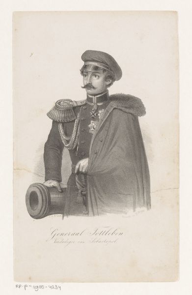 Carel Christiaan Antony Last created this portrait of Christophe Léon Louis Juchault de Lamoricière using lithography. The composition directs our gaze centrally towards the figure of Lamoricière, whose posture and attire denote authority. Last employs shading to give depth to the general's face and uniform, creating a sense of volume. Note how the ornamental details on his shoulders and the texture of his hat are carefully rendered. The use of lithography allows for fine lines and tonal gradations, essential for capturing the nuances of light and shadow that define the figure. The contrast between the detailed rendering of the subject and the relative plainness of the background focuses our attention, emphasizing the subject's presence. Last’s work serves as an enduring marker of a particular moment, capturing not just the likeness of a man, but also the values and aesthetics of his time.