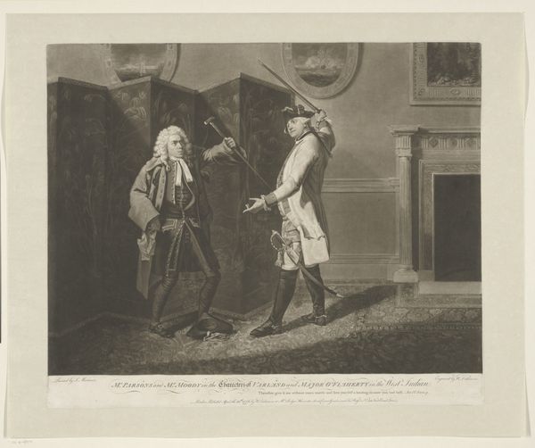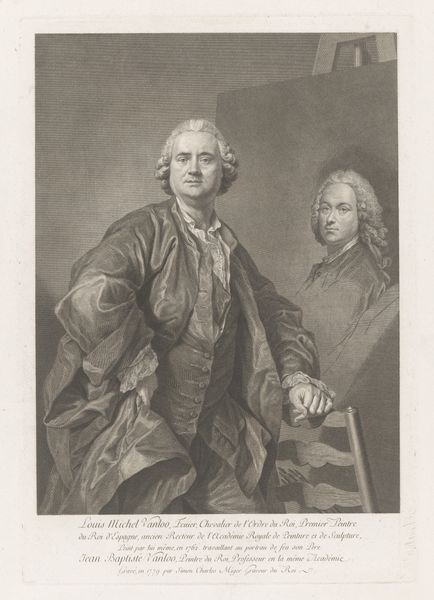 Editor: Here we have James McArdell's "Portret van John en Bernard Stuart," made sometime between 1745 and 1765. It's an engraving and depicts two men, presumably the Stuart brothers, with incredibly detailed garments. There's a theatricality about it, wouldn't you say? What catches your eye when you look at this piece? Curator: Ah, yes, theatrical is spot on. It has that Baroque drama simmering just beneath the surface. What really sings to me is the play of light. See how McArdell uses the engraving to almost sculpt with light and shadow? He teases out the textures of their silk garments and flowing hair. I can almost feel the weight of that draped fabric. Do you see it too, that tactile quality? Editor: Absolutely. The folds in the fabric are so realistic. And it is very effective, it guides your eye throughout the whole image. Do you think this image has any symbolic implications? Curator: Now you’re asking the golden questions! Given the subjects, it’s hard to ignore the historical context. The Stuart name carries a lot of weight, doesn't it? This piece immortalizes them, yes, but there's also a vulnerability. The younger brother looks off with a nervous alertness, don't you think? It makes you wonder what narratives these guys carried with them… stories etched into their expressions. What stories can you discern? Editor: I noticed that there are many political connotations in that gaze you talked about. Looking at the materials alongside this new awareness certainly enriched my understanding. Thanks so much! Curator: My pleasure. Remember, art is just a collection of dialogues waiting to happen.