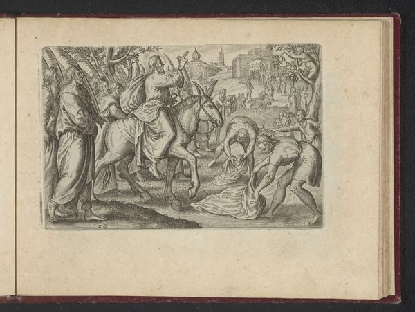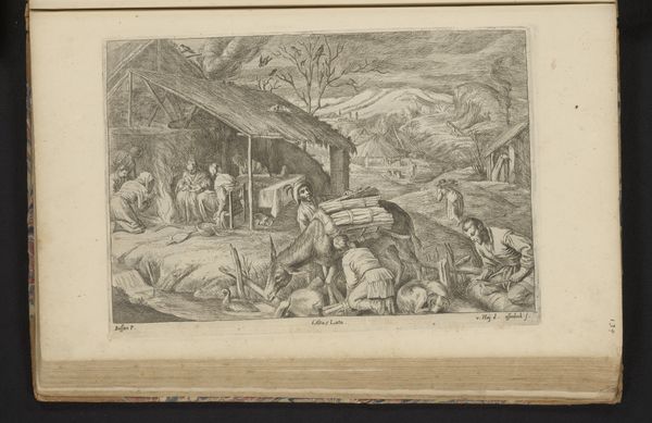 Curator: We’re now looking at "Herfst", which translates to "Autumn," created around 1660 by Jan van Ossenbeeck. This artwork combines etching and ink in its creation, offering us a fascinating glimpse into Baroque landscape and genre painting. What strikes you first about this piece? Editor: It feels…busy, yet balanced. There’s a central activity that draws the eye, then a calming landscape opens up behind. The artist clearly has a sophisticated sense of spatial composition and narrative layering. Curator: Indeed. Ossenbeeck's choices regarding etching techniques are revealing; consider the variation in line weight. It guides the viewer through a hierarchy of social labor, doesn’t it? The labor of the figures dominates the composition; consider the range of occupations captured in this small frame. We observe figures engaged in what appears to be animal husbandry, with attention to tasks such as milking, tending livestock, and reaping the autumnal harvest from nearby fruit trees. This reveals 17th-century rural labor systems and their impact. Editor: Precisely. And beyond the documentation of labor, consider the interplay of light and shadow, or the figure poses; how they contribute to a complex emotional register. Ossenbeeck manipulates depth with exceptional precision. The formal structure conveys not just space, but perhaps the era’s prevailing aesthetic principles of order and perspective? Curator: And it speaks to consumption too; consider the artist was producing etchings and drawings as print media and that prints would have circulated across regions. These prints became crucial instruments for knowledge dissemination, shaping aesthetic views and creating visual repositories documenting society’s transformations through agriculture and technology. Editor: Good point. So, considering both material production and symbolic structure… this etching becomes quite rich in possibilities, doesn’t it? Ossenbeeck wasn't just representing labor, but constructing a lens to view 17th century life. Curator: A viewpoint that allows us to understand society by depicting its most important forms of output and productivity, certainly. Editor: It allows us to reflect on his masterful treatment of form and depth, a reminder of the inherent qualities of this important period of Dutch art.