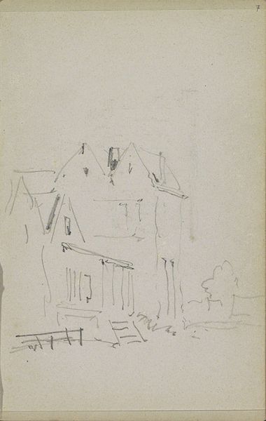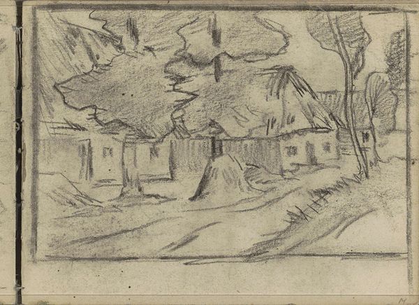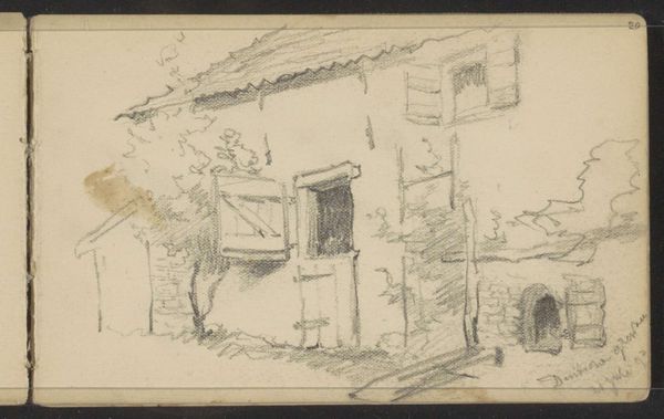 Editor: So, here we have "Voorgevel van een huis," or "Facade of a House," a pencil drawing made sometime between 1834 and 1906 by Maria Vos. It’s a rather simple sketch, yet there's a stillness to it. I'm drawn to the delicate details of the doorway. What strikes you most about this piece? Curator: You know, I’m taken by that stillness too. It feels like a quiet observation, almost a whisper of a memory. Notice how Vos uses the pencil—soft, gentle strokes, capturing not just the form of the house, but also the light playing on its surface. Do you feel how she manages to suggest texture without explicit detail? Editor: Yes, especially the rough texture of the walls contrasting with the smoother doorframe. I hadn’t noticed how much she suggests with so little. Curator: Exactly! And I wonder about her choice to focus on this small section, this intimate entrance. What do you think it might suggest about her perspective on the world? Editor: Maybe a focus on the personal, the private lives unfolding behind these facades? Or, perhaps just the beauty in the everyday. Curator: Indeed. It reminds me of a quote, something about finding poetry in the mundane. Vos invites us to slow down, to appreciate the quiet dignity of this unassuming house. Almost like a snapshot of the past... Editor: I love that! A 'snapshot' of a world long gone by; it is so fascinating how much the Artist did with just pencil and paper. It has been interesting to reconsider how this piece communicates far more than a literal rendering. Thanks for opening my eyes to a different perspective!