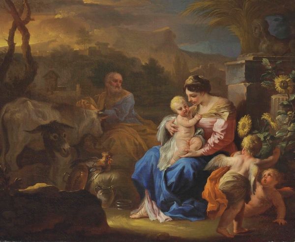 Editor: This is Giovanni Battista Tiepolo's "Saint Joseph and the Christ Child," painted around 1767-1769. The warm colors give it a feeling of gentleness, but the figures seem to float in an undefined space. What do you see in this piece, especially given its historical context? Curator: Tiepolo situates us in a nexus of power, gender, and faith. It is impossible to not see this work without understanding that artistic portrayals of father figures throughout history were not necessarily designed to embody compassion and vulnerability. Rather, masculinity has too often been presented through the lens of dominance. Looking at this painting, ask yourself, how does Tiepolo's representation reinforce or challenge such expectations of patriarchal control? Editor: So, you are saying we need to analyze not just the visual elements, but also the established cultural narratives that affect the work? Curator: Precisely. What's fascinating here is that Saint Joseph is not presented as a powerful patriarch but as a caregiver. Consider the historical context of Venetian painting; does this emotional depiction speak to a shift in societal values or a conscious effort to connect with audiences on a more intimate level, moving away from distant god-like figures in art and into more human representations? Also, how might gender roles impact his representation? Editor: It definitely makes me think about the evolving roles of men within the family structure. I never considered how artistic choices could reflect those shifts! Curator: Exactly. Thinking about social shifts, remember this piece was painted during the Enlightenment, when people questioned inherited power. Is Saint Joseph an embrace of tradition, a re-examination of masculinity, or a critique of traditional structures? Editor: I suppose it’s all of those things at once, existing in conversation with those shifts. That’s something to really think about! Thanks. Curator: Indeed. Keep looking for these tensions within artwork—the contrasts make history and cultural understanding relevant to our understanding.