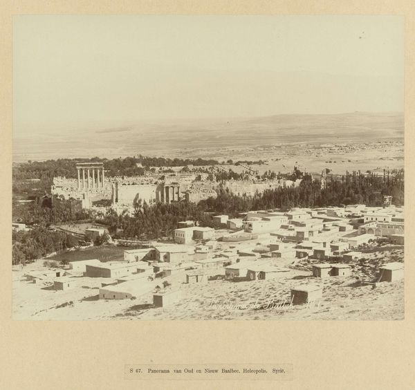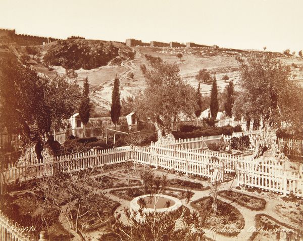 Curator: Fèlix Bonfils’ photograph, “Gezicht op de tuin van Getsemane, Jeruzalem,” dating from around 1867 to 1877, presents us with a gelatin silver print now housed at the Rijksmuseum. Editor: It’s striking. The sepia tones lend a melancholic air, and the composition, with the figures almost hidden amongst the architectural and botanical elements, speaks of something both intimate and expansive. Curator: The “orientalist” style situates the artwork within the socio-political context of 19th-century Western attitudes toward the Middle East. How do you think that factors into how this image of Gethsemane might have been received? Editor: Absolutely. This photograph would have catered to a Western audience eager for exotic imagery, while also serving a documentary function. Notice the labor evident in creating this carefully ordered garden space in the desert landscape and, more pointedly, the gelatin-silver printing process and the mass reproduction it made possible. These photos reinforced particular power dynamics between the colonizing and colonized populations. Curator: That connection between the landscape, its representation, and imperial narratives is key. Bonfils was part of a larger phenomenon of photographers creating a visual record of the Middle East. But it is also crucial to recall this garden as a cultivated and constructed location through intense labor. Editor: Precisely. The photograph doesn’t just depict Gethsemane; it participates in constructing it as a space with political significance for a specific, viewing public. Consider the visual markers included by the photographer that reinforce notions of sacredness—and who these constructions of sacred places benefitted in that period. Curator: And, of course, how it exists now, reshaped by that history. The print's existence within the Rijksmuseum makes it an object that's been carefully selected and conserved—a reminder of how institutions shape art's narrative and access. Editor: Right. It started as documentation, functioned as art for collectors, and became a vehicle to understand political ideology! Well, looking closely reveals how complex even seemingly straightforward landscape imagery is, and just how enmeshed art is in the production of culture. Curator: Indeed. Bonfils’s photograph gives us layers of consideration around material culture and institutional forces at play during that time.