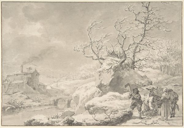Franciscus Andreas Milatz created this landscape drawing with washes, the work is titled "Landschap met wandelaars op pad langs bos". Dominating the composition is a large tree on the left, its branches and foliage meticulously rendered, creating a dense, almost palpable texture. The monochromatic palette reinforces a sense of calm, the varying shades providing depth and structure. Milatz's manipulation of light and shadow plays a critical role here. The light gently filters through the leaves, casting shadows that delineate form and space. This artistic choice creates a structured, ordered landscape, reflective of the Enlightenment's emphasis on reason and clarity. In this drawing, Milatz navigates the representational conventions of his time while subtly engaging with emerging aesthetic ideals. The formal elegance of the piece draws us into a world where nature is not just observed but carefully constructed.