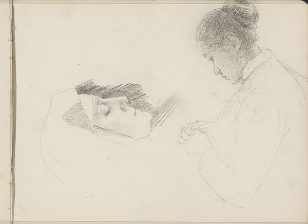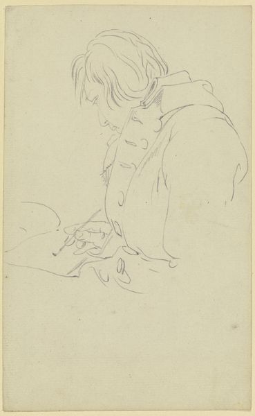 Editor: This is "Woman at a Table," a pencil drawing by Andreas Schelfhout, created sometime between 1797 and 1870. It’s currently held at the Rijksmuseum. The immediate feeling I get is one of intimacy, observing this woman so intently focused on what she's doing. What catches your eye? How would you interpret it? Curator: The work immediately impresses as a study in form and line. Note how Schelfhout uses the pencil to delineate planes of light and shadow. Consider the economical strokes that define the woman’s face, contrasting with the more textured rendering of her dress. Editor: So you’re seeing it less as a portrayal of a person and more as an exercise in technique? Curator: Precisely. Observe the compositional structure. The diagonal of the table, bisecting the picture plane, leads the eye directly to the focal point: the woman's hands. And notice the repeated circular forms – the plate, the object she holds – echoing and reinforcing this focal point. How do these choices affect your perception? Editor: I see what you mean. The circular repetition definitely draws my focus. It’s almost like the whole composition is spiraling inwards, keeping my eye glued to her activity. But is there something to read in this very activity? The manipulation of the object... Curator: Speculation beyond visual evidence risks interpretive excess. Formal analysis anchors us. We analyze line, form, and composition. It transcends mere subject matter to communicate, regardless of its inherent significance. Editor: So, from a formalist perspective, the ‘what’ doesn't really matter as much as the ‘how’? It’s more about *how* she's rendered than *what* she's doing. Curator: Precisely. Through the manipulation of artistic elements, Schelfhout elevates a simple sketch to a work of structural integrity, inviting deeper consideration on the fundamentals of its composition. Editor: I guess I came looking for a story and found a masterclass in visual language! I appreciate seeing it that way. Curator: Indeed, by looking beyond subject and into the inherent qualities of the work, new interpretive pathways become apparent.