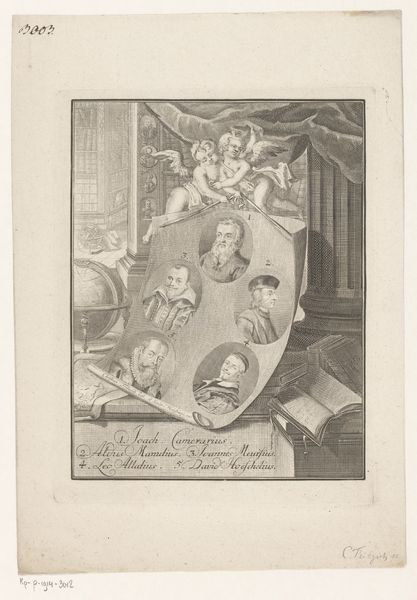 Editor: Here we have a print from around the 17th century, "Portrait of Abraham Bloemart." It seems to be an etching or engraving. At first glance, it has a collage-like effect, almost like a bulletin board of images surrounding the central portrait. What leaps out at you? Curator: Well, isn’t this a delicious oddity? Forget formal portraiture, this feels like stumbling into the artist’s mind. Bloemart’s dignified image peeks out from a riot of printed ephemera. Notice those little "advertisements"? "Prints and Indian Pictures Cleaned Very Well" screams one! This isn't just a portrait; it’s a snapshot of the 17th-century art market. It’s witty, almost proto-Pop Art, don’t you think? Editor: That’s such a fun way to look at it! I was so focused on the technique, I almost missed the social commentary. Are those other little pictures samples of what they are cleaning? Curator: Precisely! Or perhaps a knowing nod to the range of art Bloemart moved within – the classical portrait, alongside genre scenes, even colonialist imagery. It is a rather sardonic display, a wink that makes you wonder what Bloemart himself would think of it all. And that framing oval? Almost feels like it's mocking the formality it pretends to uphold. Editor: I love the idea of the artist having a sense of humor about his work! It certainly turns a standard portrait on its head. Thanks! I’ll never see these kinds of portraits the same way again. Curator: My pleasure! The best art is like a good joke, the more you look, the more you "get" it, the deeper it resonates. Isn't it marvelous?