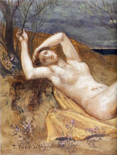 Editor: This is "Young Girls by the Sea" by Pierre Puvis de Chavannes, painted in 1894 using oil on canvas. There's a certain stillness about it; the figures and even the landscape feel very posed and deliberate, almost like a classical frieze. What do you see in this piece? Curator: Precisely. One must first observe the tripartite composition. The artist employs a distinct foreground, middle ground, and background, creating spatial recession and rhythm. The limited color palette further emphasizes the structure, wouldn't you agree? Editor: Absolutely. The muted colors and hazy atmosphere add to the dreamy quality. Are there any underlying visual cues that enhance that aspect of dreaminess? Curator: The treatment of form is noteworthy; figures are idealized and rendered with smooth contours, characteristic of Academic art. Moreover, consider the lack of distinct modeling and shadow; how do you feel that impacts its reading as 'real'? Editor: I see what you mean. It flattens the image and enhances its timeless, symbolic quality. Do you also feel that the subjects evoke particular symbolism or schools of thought? Curator: A semiotic examination reveals intriguing patterns. The arrangement of figures and the coastal setting might reference classical allegories of youth, beauty, and mortality. How do the poses themselves speak to this symbolism? Editor: The reclining figure, maybe, suggests languor and contemplation; the one arranging her hair, a sense of vanity, perhaps? I also feel the landscape looks 'manufactured'. Curator: That tension between naturalism and artifice is essential. Chavannes utilizes a visual rhetoric predicated on stillness. His mastery of pictorial organization creates, indeed, a calculated arrangement intended for careful reflection, which is why he is great. Editor: That’s such an intriguing reading. The piece becomes much more deliberate in its construction. It's been eye-opening looking beyond the surface! Curator: Precisely, our analytical journey should always consider all angles, hopefully further enriching both our understanding of this and future artworks.