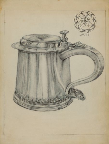 Editor: This is Harry Goodman's "Pewter Tankard," a pencil drawing created between 1935 and 1942. It has this incredible reflective quality for a simple pencil drawing! I'm curious, what layers of interpretation might we uncover when examining an object so seemingly ordinary? Curator: An ordinary object, perhaps, but objects speak volumes. Consider the context: crafted during the interwar period. What might a pewter tankard symbolize during a time of economic depression and looming global conflict? Think about the role of pubs, especially for working-class men. Could this drawing represent a longing for community, for normalcy, or even escape? Editor: So it's less about the tankard itself and more about what it represented socially? Curator: Exactly. We can even explore the visual language Goodman uses. The realism. The painstaking detail. Is this a celebration of craftmanship, a nostalgic look back to simpler times, or perhaps something more critical? Who would have been drinking from a pewter tankard, and whose stories are silenced by its presence in a museum? Editor: That is interesting...the silent stories, and considering what it might represent to different groups of people. This drawing is deceptively loaded. Curator: Indeed. Art invites us to question the narratives embedded within everyday objects, to consider power, identity, and the complex relationship between the individual and society. I hope this helps. Editor: Absolutely! Thinking about objects as a point of access for all of these themes of social history makes me look at this—and all art—so differently. Thanks!