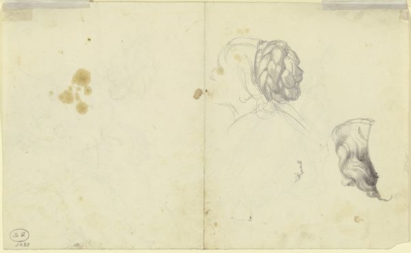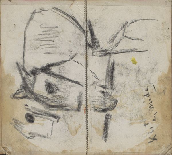 Curator: This piece, held here at the Rijksmuseum, is entitled "Vrouwenhoofd met hoed, in profiel," or "Woman's Head with Hat, in Profile," rendered by Isaac Israels between 1887 and 1934. It’s done with coloured pencils on paper. Editor: There's a haunting fragility to this work. The hurried, almost ghost-like lines, combined with the muted palette, suggest a fleeting impression, like a memory fading at the edges. I'm immediately curious about who she was, this woman shrouded in suggestive form. Curator: Well, Israels was certainly part of the Dutch Impressionist movement, moving away from strict academic portrayals, engaging instead with the reality of the subject and emphasizing how the sitter affected society. So the very sketchiness you observe can be seen as intentional, capturing a transient moment in time. Editor: Right, and isn’t it fascinating that we see her "in profile"? We're given just a glimpse. It raises interesting questions about women in that era. Were their identities often partially obscured, seen only from certain angles, socially dictated perspectives? Was Israels deliberately playing with this restricted view? Curator: It could also be seen that the use of the sketchbook recalls the way the street became a kind of ‘studio’ during that period. Think about how the rapid urbanization changed not only what artists saw, but how they could portray their reality. A rapid, sketchy form allowed him to represent these new impressions. Editor: That's a great point. Urbanization fundamentally altered social interactions. Consider this woman's social class as well—her hat likely signifies status, respectability, a carefully constructed identity within an emerging modern world. Israels' impressionistic rendering invites us to decode that very identity. How was the artist participating in or critiquing such constructions of gender and class through his style? Curator: His work generally reflects the social changes that were sweeping across Europe and beyond, in both subject matter and approach. It's part of a move that brought about entirely new subjectivities in the context of modernity. And to represent such things also changed the institutions of art and artmaking. Editor: Looking at the raw, vulnerable quality of those pencil lines, though, I think this goes beyond just observation or institutional change. I’m particularly touched by the brown smudges along the lower part, where you can still see the figure. To me, it expresses an emotive intimacy, an effort to intimately engage with a lived reality behind social surfaces, something shared between artist and model. Curator: Ultimately, “Vrouwenhoofd met hoed, in profiel” becomes a potent intersection between historical context, social commentary, and deeply personal artistic expression. Editor: It really makes us question the transient nature of existence and representation, both then and now.