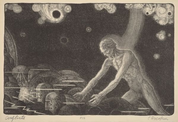 Editor: Carl Hoeckner's 1935 print, "Directions," feels like a layered dreamscape, a little unsettling but intriguing. It has these almost ghostly faces and swirling lines. What do you see in this piece, especially considering the title? Curator: The "Directions" evoke, for me, a very specific yearning. The faces, almost like ancestral figures emerging from the collective unconscious, hint at paths charted over generations. Notice how the light seems to emanate from within these figures. It suggests an inner compass. Doesn't it feel like a search for meaning, guidance passed down but also intensely personal? Editor: Yes, I see that now! The overlapping faces... like echoes of the past and present all at once. But the swirling lines – are they paths, or perhaps confusions? Curator: Perhaps both? Remember, symbols rarely have fixed meanings. The circle is a potent archetype across cultures – representing wholeness, cycles, time. In this context, though, the lines feel exploratory, like synaptic pathways firing within the mind as one grapples with decisions. Do you find a sense of resolution or more questions lingering as you view this artwork? Editor: More questions, definitely. It's not a piece that offers easy answers. I appreciate that it acknowledges the ambiguity in seeking "directions," as it doesn't show an arrow or set path. Curator: Precisely. Hoeckner’s visual language embraces the complexity of the human experience. Symbols serve not to simplify but to enrich, reminding us of the profound depth beneath the surface of even the simplest journey. Editor: This has changed my perspective completely. Thank you! Curator: My pleasure! It's in questioning that we find deeper connection.
