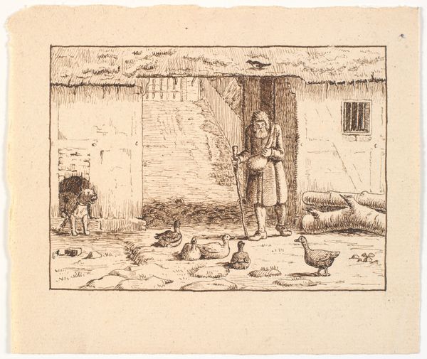 Curator: Charles Jacque's etching, "Washer Woman," from 1845, presents a scene of daily life in what appears to be a working-class neighborhood. It’s currently held here at the Metropolitan Museum of Art. Editor: My first thought is the sheer weight of the woman’s labor. You can almost feel the heft of the water-soaked laundry she’s about to tackle. There's an oppressive atmosphere conveyed by the close quarters and the visible signs of poverty. Curator: It’s significant to consider the context of genre painting during this era. Jacque, like many of his contemporaries, found artistic merit in depicting the lives of ordinary people. The image subtly challenges the romanticized depictions of rural life so prevalent at the time, and perhaps shines a light on a kind of labor generally performed by women. Editor: Absolutely. We have to think about whose stories get told, and by whom. This woman isn't idealized; she’s captured in a moment of strenuous activity. And let’s not ignore the children in the background. This etching gives us insight into the economic and social structure of 19th-century labor where childhood is spent on the margins of adult labor. Curator: Indeed. Looking closely, we see how Jacque uses the etching technique to create intricate details—the texture of the woman's clothing, the rough-hewn wood of the buildings, and the messy accumulation of tools. There's a strong sense of realism. It isn’t glorifying hardship, but capturing a slice of lived experience. Editor: I find myself thinking about the absent male figure, who’s most likely performing his own strenuous job. How do race and class affect not only the subject’s relationship to her family, but the relationship with this viewer looking into a specific kind of poverty? This image sparks these broader dialogues. Curator: Precisely. And considering how art institutions often focus on privileged narratives, this etching acts as a poignant reminder of the myriad untold histories that shape our understanding of the past. Editor: I’m grateful for art like this—that prompts necessary interrogations of how power and visibility intersect, particularly around gender and labor. Curator: For me, seeing this artwork really enhances my understanding of 19th century social life and how this period is framed.