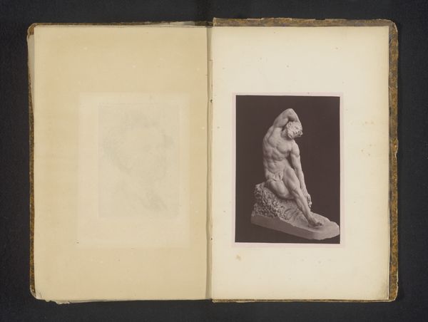 This is Stephen Thompson’s photographic print of the Sculptuur van Theseus door Phidias. The image captures a sculpture within a book, rendered in stark monochrome. The sculpture itself is in the throes of dynamic movement, caught in a moment of arrested action. The contrast between light and shadow accentuates the muscularity and tension in Theseus's form. Thompson’s cropping and framing create a sense of compression, almost as if the figure is struggling against the confines of the photographic space. The sharp angles and deliberate contrasts within the frame challenge our perception of space and form, creating an almost claustrophobic tension. The book’s very structure—its material form—becomes a metaphor for confinement and the limits of representation. Consider how the composition invites us to reflect on the nature of history, documentation, and the ways in which art and ideas are mediated through different forms. The image becomes a site of philosophical inquiry, questioning the stability of meaning and the ever-present negotiation between form and interpretation.