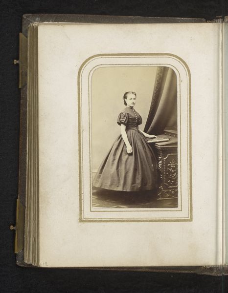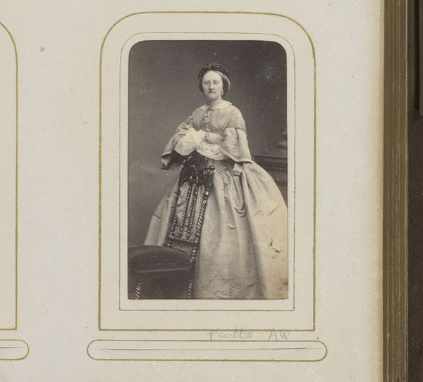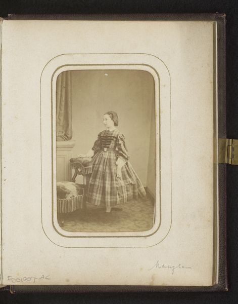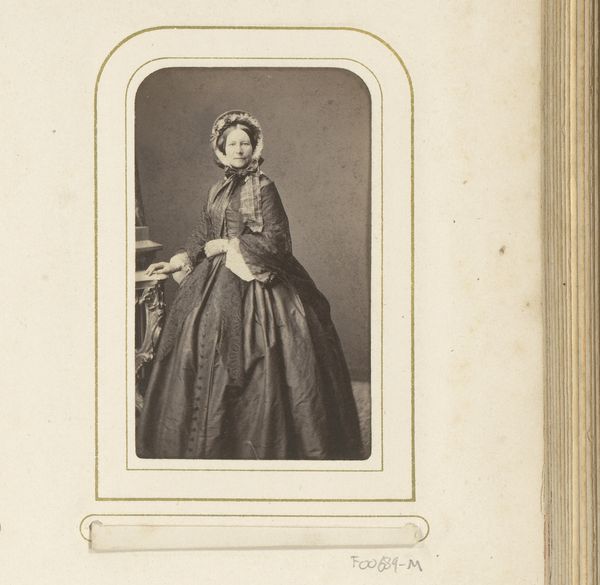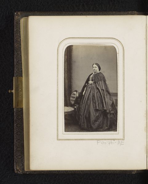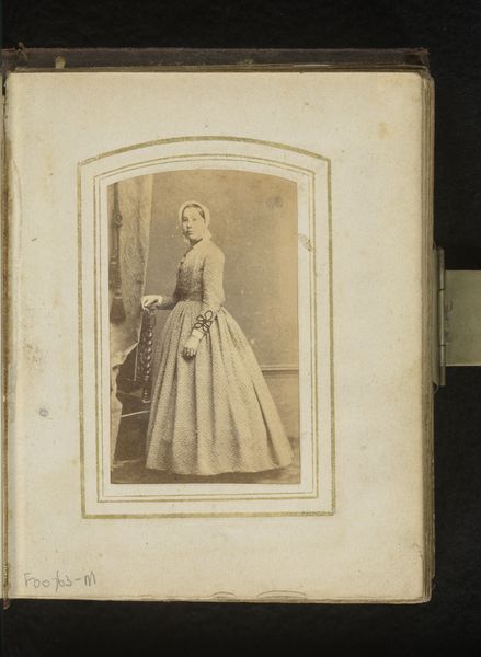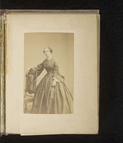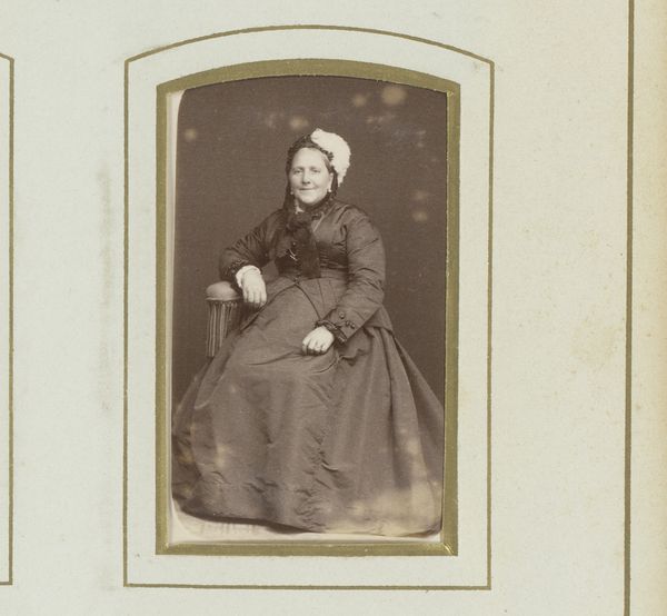 Editor: Here we have Albert Greiner’s "Portret van een vrouw met bont sjaal," or "Portrait of a Woman with Fur Scarf," created sometime between 1861 and 1874. It’s an albumen print, a photograph, so it's interesting to consider it a portrait. There's a stillness and formality to the image that I find rather striking. What do you see in this piece? Curator: It’s fascinating how the formal conventions of portraiture, typically associated with painting, are translated into the photographic medium here. The fur stole is an obvious marker of status and wealth, but also warmth, safety and comfort. Do you notice how the window is slightly open behind her? What does it suggest that this person needs this warmth? What could be 'unhomely' in the scene despite all of the other indications of wealth and status? Editor: I hadn’t really thought of the symbolism there, more just that it filled the background. I see what you mean though. The window lets us consider some type of exposure. Do you read something particular into the woman's expression? Curator: Her gaze, direct but perhaps a touch melancholic, invites a reading of the inner life, doesn’t it? We are peering into a moment of presented composure. The plaid pattern of her dress might signify a connection to tradition or perhaps simply reflect the fashion of the time. Plaid had different cultural meanings in Europe at the time too... do we see her individuality or something else in that marker of community? Editor: I find that idea so interesting - this dance between the individual and the social. This idea of encoded meaning through both status symbols and more mundane choices really enriches my understanding of portraiture. Curator: Indeed, considering the portrait through its visual symbols allows us to ask fresh questions about how identity is constructed, performed, and preserved across time and through media.