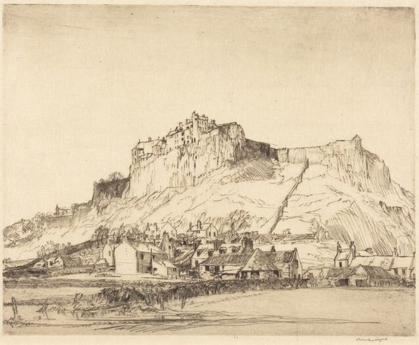 Curator: Looking at this etching titled "Stirling Castle, No. 2," crafted in 1909 by Muirhead Bone, I am immediately struck by the immense scale Bone has conveyed in this landscape, particularly of the rockface upon which Stirling Castle sits. Editor: The almost severe monochromatic palette creates a sense of somber history looming over the domestic space, these small humble buildings are dwarfed. I mean, it is a romantic perspective on power and its relationship to the common person. Curator: Precisely. Muirhead Bone gained recognition for depicting architectural subjects during a time of massive change in urban centers and industrial landscapes. He presents a realistic vision of Stirling Castle as it sits enthroned above the town and its citizens. Editor: And that's what I find so captivating—the castle as both a historical monument and a symbol of dominance, the way he has angled the foreground to emphasize the steep incline further intensifies the castle’s imposing stance. Curator: Bone’s skillful handling of etching techniques really draws our eyes toward that striking rocky base. You can almost feel the geological force. His meticulous lines offer texture in every plane, but more dramatically here. It feels less about celebrating grandeur, and more a focus on nature and architecture in combination. Editor: I agree that the artistry is amazing but how might his aesthetic choices impact our contemporary views on institutions and power structures? Especially with consideration to today's post-colonial frameworks where we consider who are monuments for and who do they serve? Does this etching reinforce a romanticized perception of these old power dynamics? Curator: That’s an astute point. These are questions that continuously shift across time and artistic interpretations. How does art participate in the wider dialogues regarding societal equity? How do museums interpret works of art with sensitivity and historical accuracy? This work reminds us to always reevaluate power in context and artistic intention in a social construct. Editor: So many of these images serve as points for discussions about value. We cannot let historical imagery stand unopposed, without that ongoing inquiry.