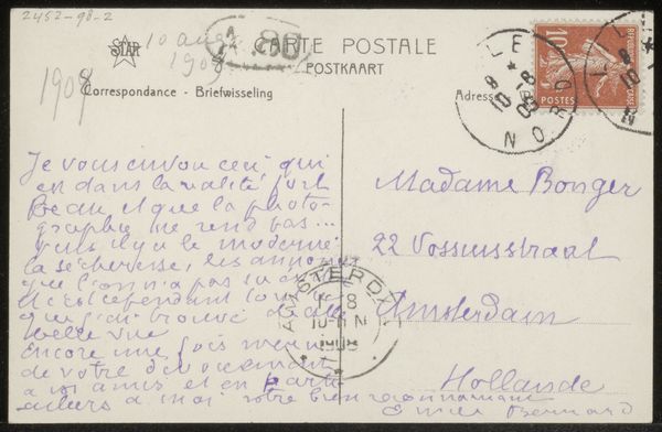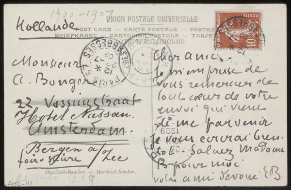 Curator: At first glance, the composition feels quite balanced, despite the clear separation of the message on the left and the addressee's information on the right. The ink calligraphy appears dark against the card's pale surface, emphasizing the texture. Editor: What you're seeing is a postcard sent by Emile Bernard to Andries Bonger and Anne Marie Louise van der Linden, likely before 1913 given the postal stamp. It's rendered in ink, primarily functional as a communication tool, but also a material artifact that reflects postal systems of the time, its cost determined by distance and standardized international mail agreements. Curator: Indeed. There is a structural elegance even in its utilitarian design. Note the distribution of pictorial elements—the cancellation stamps—balanced by the formal stamp. It's a deceptively simple layout creating visual harmony. Editor: Don’t forget the social dynamic! The Boker family, Vincent’s confidantes and art collectors, and Bernard’s relationship to the market! This humble ink artwork carries a huge significance related to that era's trading practices, networking strategies, and artistic partnerships. Curator: Of course. Beyond its commercial aspects, Bernard's handwritten text contributes to its personal intimacy. Look at the curves and line quality in "E. Bernard," suggesting both casual familiarity and a cultivated aesthetic sensibility. Editor: Exactly. We see both intent and process. Paper sourcing from mills, ink mixtures affecting permanence, and distribution routes each tell different parts of its rich making and meaning— not solely the hand of a "genius". Curator: So, viewing this artwork we're considering not just what is aesthetically apparent, but considering what historical relationships it can embody, how simple materials were consciously organized, to subtly carry complex cultural meaning. Editor: Agreed. This examination reveals what simple exchange, made economically feasible and systematically reliable through material infrastructure and labour, had on interpersonal connection and on the early formation of modern art collecting.