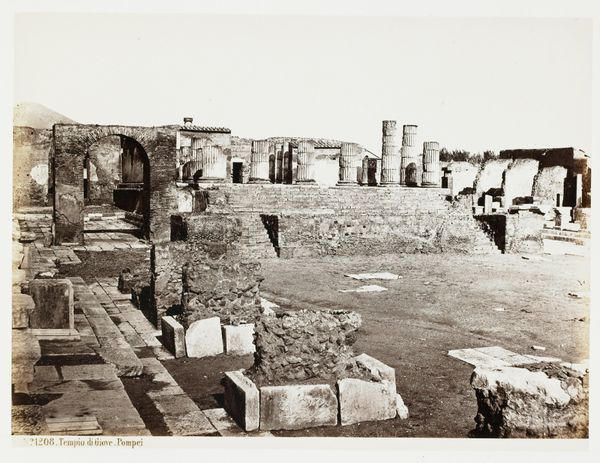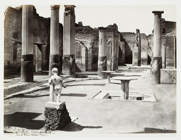Giorgio Sommer made this albumen print, "Casa di Marco Oleonio," sometime in the 19th century. At first glance, the symmetry and repetition of the columns draw the eye deep into the frame. The artist captures the scene in monochrome, emphasizing tonal contrasts to highlight the ruined architecture. The composition creates a dialogue between past and present. Sommer uses the architectural remnants of Pompeii to suggest an enduring quality that transcends temporal boundaries. Each element, from the fragmented columns to the statue in the foreground, acts as a signifier. These signs invite viewers to contemplate themes of mortality, memory, and the cyclical nature of civilization. The formal qualities of the print – its tonality and depth – prompt reflection on how we, as viewers, construct meaning from ruins. This visual language, rich with historical and cultural codes, encourages us to question fixed interpretations. We are left to consider how ruins like those in "Casa di Marco Oleonio" can challenge our understanding of history and time.