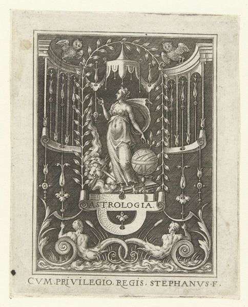Curator: This print, held here at the Rijksmuseum, is entitled "Ariadne in een ovaal." It's an engraving by René Boyvin, created sometime between 1551 and 1580. What's your immediate impression? Editor: It strikes me as incredibly ornate. The composition, packed as it is, leans heavily on curvilinear forms. The central oval containing Ariadne is almost overwhelmed by the decorative elements. The linework is exquisite, a testament to the engraver's skill, but it's nearly too busy. Curator: I see that, and I think the richness of the ornamentation tells us something. The oval framing Ariadne recalls ancient cameos and engraved gems—objects that signified wealth, status, and taste during the Renaissance. These emblems spoke to a shared understanding of classical antiquity, and possessing that knowledge elevated one’s position in society. Editor: Yes, I note how Boyvin uses line to delineate form, texture, and spatial depth. Observe the differences in the linework employed to represent various materials like stone versus the texture of flesh. It's a veritable feast of visual information encoded by these delicate marks. And consider that everything stems from the single burin creating those lines. Curator: Absolutely, the technical virtuosity is remarkable. But consider also Ariadne herself. Deserted by Theseus on Naxos, she's traditionally depicted in a state of grief and abandonment. Here, however, she appears self-possessed, almost defiant, anticipating her divine union with Bacchus. The engraving's Latin inscription hints at this, suggesting that youth isn't always the best advisor, hinting towards her fate. Editor: A very persuasive interpretation. And if we continue our visual deconstruction, notice the balance Boyvin establishes. Despite the intense decoration, a symmetry binds the piece together—look at the opposing beasts flanking the central oval. Though dynamic in their postures, they create a visual anchor that provides a sense of stability amidst all of the swirls and flourishes. Curator: Exactly. The various animal figures that adorn the space—the goat, the fantastic creatures above, all drawn in a swirling fashion—suggest the abundance and celebratory spirit associated with Bacchus and the promise of a renewal for Ariadne, even following her deep grief. Editor: So ultimately, it's through this careful interplay of compositional elements and masterful lines that Boyvin constructs this message, transforming an intensely decorative engraving into a potent symbolic representation. It's rather brilliant. Curator: I agree. It truly shows us how artists and designers used mythological narrative to connect the viewers of their era to enduring ideals and also how those stories themselves change.
