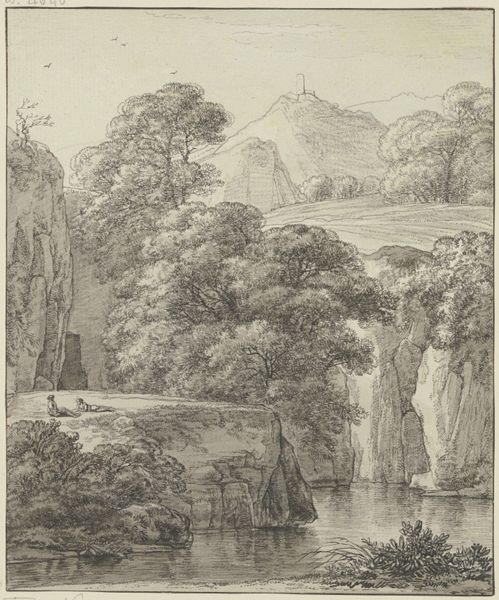 Curator: Here we have an etching entitled "Mountain landscape with staffage" by Franz Kobell. The artwork is held at the Städel Museum. Editor: It’s quite striking! The level of detail achieved just through lines and shading creates such a depth to this idyllic landscape. It evokes a certain calmness, wouldn't you agree? Curator: Yes, that feeling is deliberate. Kobell created many landscapes that idealize nature. This ties into the Romanticism movement's fascination with unspoiled wilderness and their relationship to feeling and expression. It challenges the prevailing academic views of painting within his artistic circles. Editor: It's interesting how the artist incorporated "staffage"—the little figures placed into the composition. How do you feel about their placement? What do they mean to the composition? Curator: It was customary within history painting; to add minor figures as part of an overall allegorical message or compositional device. By including figures along the shoreline, Kobell creates scale but also asks the viewer to reflect on the history represented through such images of contemplation in a picturesque environment. Editor: It appears like they are in contemplation... Maybe even melancholic. Curator: Interesting perspective. Landscape paintings and works of art were important politically and shaped views of specific landscapes as sites of national heritage. He challenged some political notions in that same stroke through landscape imagery that had strong philosophical concepts and visual metaphor. Editor: It feels that this natural world might invite all those grand reflections of human destiny or spirituality you discuss and I recognize! Curator: Agreed. The piece showcases how seemingly simple natural images could become very complex visual arguments about place, nation, and history itself when distributed through exhibitions, print culture, and state institutions of his day! Editor: Understanding his intent does expand how the artist manipulates such powerful signs of the natural world. Thank you! Curator: Of course. These kinds of pieces become all the more interesting as we explore them further.