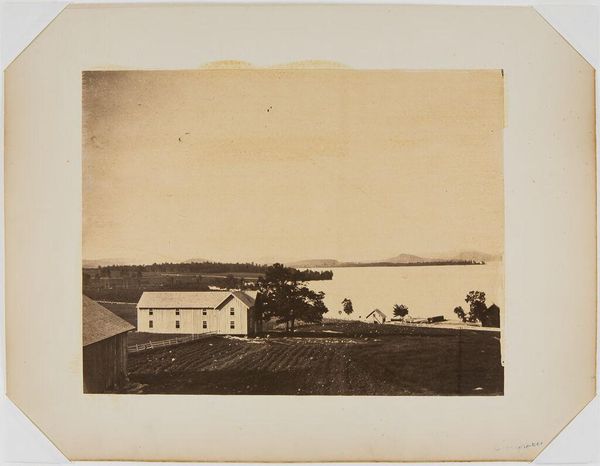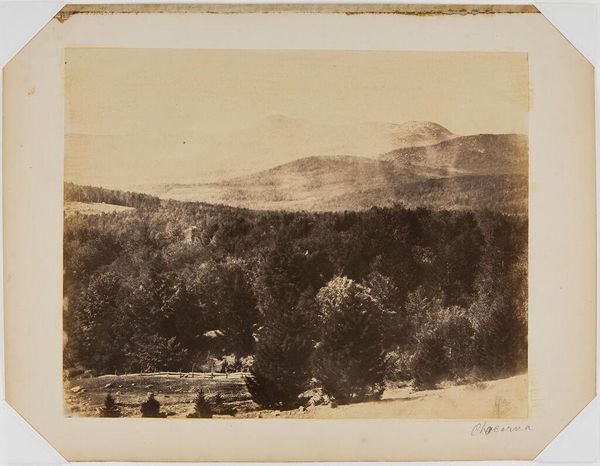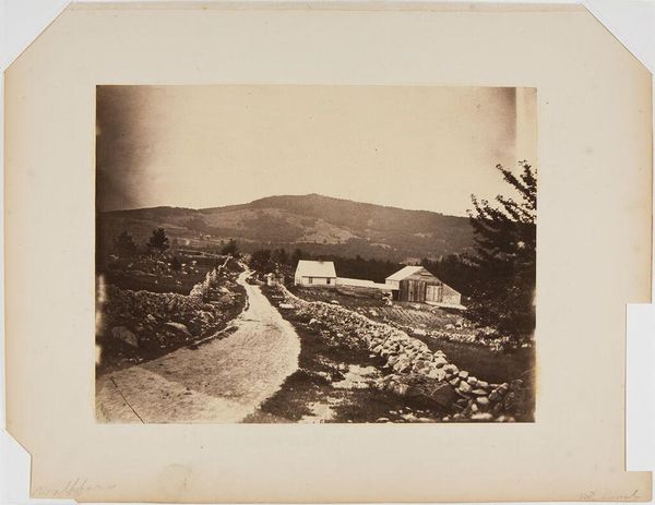 Editor: This is John Adams Whipple's photograph, "Ledges in North Conway, from Mrs. Keith's." It's a peaceful landscape, but there's also a sense of human encroachment on nature. What's your take on it? Curator: I see a commentary on the evolving relationship between humanity and the environment in 19th-century America. The sublime mountain backdrop contrasts with the cultivated fields. It speaks to manifest destiny and the taming of the wilderness. How does this contrast make you feel? Editor: It feels a bit bittersweet. There's beauty, but also loss. Curator: Precisely! It highlights the complex narrative of progress, where natural beauty is simultaneously revered and reshaped. It's a tension still relevant today. Editor: That's a powerful connection. I'll definitely look at it differently now.