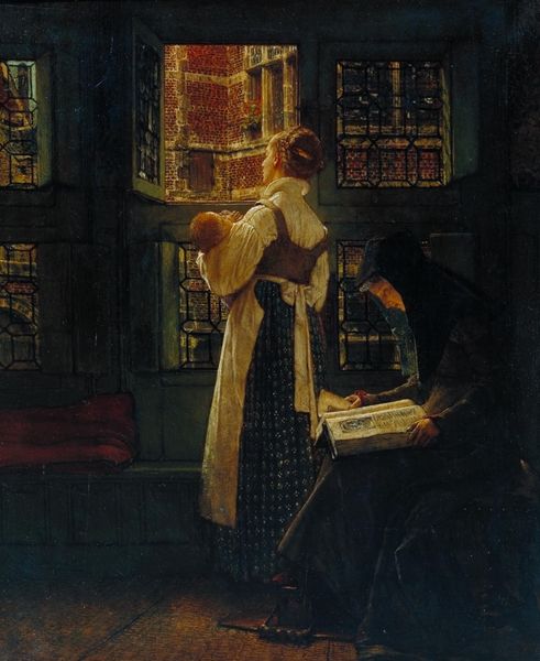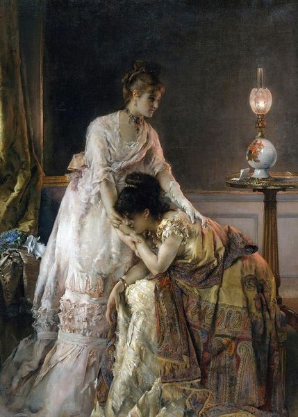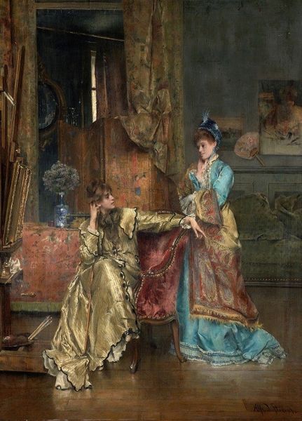 Alfred Stevens created "Pleasant Letter", likely in the mid-19th century, using oil on canvas. The painting's composition draws us into a private world of two women. Notice how Stevens uses a muted palette, predominantly browns, blues, and greens, to create a sense of intimacy and reflection. The soft, diffused light enhances this mood, casting gentle shadows that soften the scene. The arrangement of the figures and objects subtly guides our reading of the painting. The women are positioned close together, yet each is engrossed in her own thoughts, highlighted by the contrast in their attire and expressions. The fallen letter on the floor and obscured interior, filled with decorative objects, contribute to the impression of a complex narrative just beyond our grasp. "Pleasant Letter" captures a moment of quiet contemplation, inviting us to consider the subtle dynamics of communication and relationships. It reminds us that meaning is not always explicit but often lies in the unspoken and unseen.