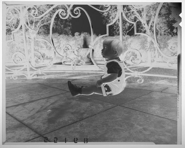 Curator: Here we see Martin Schweig’s untitled photograph of four children posed along a wrought iron fence. What strikes you first about it? Editor: It's eerie, almost ghostly, with those inverted tones. Gives me a shiver, like a half-remembered dream. Curator: The work certainly uses the photographic negative to create a sense of alienation. Notice how the uniformity of the striped shirts suggests a conformity imposed on youth? Editor: True, there's a sense of forced order, yet each kid has a slightly different stance, a quiet rebellion in their body language. That one clutching a bag...what's in there? Secrets? Curator: Perhaps. Ultimately, Schweig's choice to invert the image challenges us to question the supposed innocence of childhood itself, and the power dynamics inherent in representation. Editor: I'm left wondering, what were they thinking, standing there like that? It's a puzzle, wrapped in a slightly scary package. Curator: Indeed. A reminder that even the most seemingly straightforward images can hold layers of complexity and untold stories.