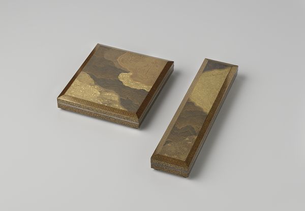 Curator: This is a rather wonderful piece from the Rijksmuseum's collection: a square box created sometime between 1700 and 1800. The museum attributes it to an anonymous maker. It features pines and cherry blossoms in maki-e on a nashiji ground. Editor: It’s subtle, isn't it? The miniature landscape in gold against that speckled backdrop. There’s a definite elegance in its geometry. Curator: Elegance cultivated over what must have been considerable labor. Maki-e, sprinkling metallic powder into lacquer, is intensely painstaking. And the nashiji ground, that pear-skin texture, is built up from multiple translucent lacquer layers. This piece speaks of ritualized production, each step adhering to codified traditions of craftsmanship. The metal gives the impression of permanence, doesn't it? A quiet grandeur. Editor: Yes, that controlled craft also played a significant role in a specific culture. A piece like this signals not just wealth but taste, the access to particular artistic skills fostered within a certain society. Its acquisition then signifies that access as power. Curator: Precisely! And given that many such boxes were made for export, often adapted to European tastes while still being produced under strict workshop controls, we can think about this object in the context of trade routes. Was it intended for the Japanese market or further afield? Editor: What would its original purpose have been, beyond the symbolic, as it was integrated into domestic life? These small precious containers served many purposes in elite Japanese households. They often played central roles in intimate ceremonies like tea drinking and were kept nearby for small storage needs. Curator: To see such an object preserved offers insights into artistic transmission. We are privy to seeing these now, generations later in a space of curation. Editor: Indeed, and considering the many hands that would have been part of its creation and those that cherished it in use, before becoming an artifact. It brings a unique cultural depth.