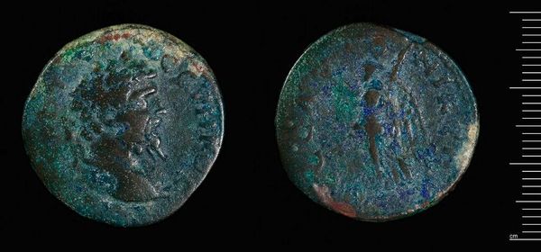 Curator: The patinated surface of this copper coin, the Follis of Maximian, really gives it a palpable sense of age. The green and brown hues evoke a sense of history. Editor: Indeed. It reminds us that this was once a common, everyday object, produced at the Ticinum mint, shaped by political and economic forces. Curator: Absolutely. The coin depicts Maximianus I Herculius. It’s an intriguing artifact that speaks to power dynamics and imperial propaganda of the era. Think about the emperor's efforts to shape his public image! Editor: And consider the coin's circulation; its significance isn't just in its creation but how it was used and perceived by the public in the context of Roman society. Curator: Right. This coin represents not just currency, but a statement, a reflection of the emperor's authority and influence, particularly relevant when exploring issues of identity and control. Editor: It’s fascinating to consider how such a small object can offer insights into the vast social and political landscape of the Roman Empire. Curator: Examining this follis prompts us to question how power manifests in the everyday. Editor: A potent reminder of the role of objects in shaping our understanding of the past.