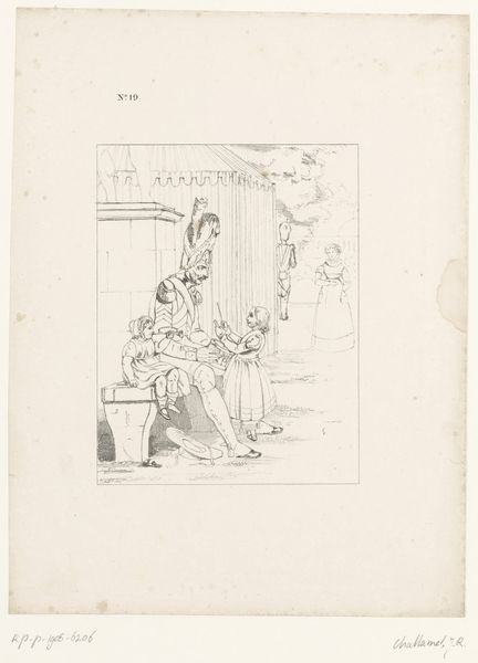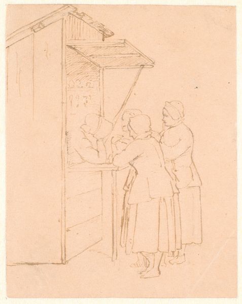 Curator: This pencil drawing, dating back to possibly 1895, is titled "Tijdens de kermis," which translates to "During the Fair." It's by Salomon Goslinski, a Dutch artist known for his caricatures and genre paintings. Immediately I'm struck by the stark simplicity. The artist’s deliberate and economic use of line directs my eyes to a very melancholic encounter. Editor: Melancholic, yes. But I'm drawn more to the figures themselves, to the contrasting visual rhetoric used in depicting them. There is Apollo, seemingly animated, stepping towards what I can assume represents his captive: a royal yet despairing statue. We are visually seduced by a highly formalized and somewhat cruel narrative about freedom, identity, and dispossession. Curator: Absolutely, and considering the fair as a site of spectacle, this piece invites us to consider the commodification of power, and particularly of royalty. Perhaps Goslinski is commenting on the decline of monarchies in the face of burgeoning modernity, showcasing the spectacle of what was. The use of ancient Greek costuming and allegorical names definitely points in this direction, particularly if you understand this work through contemporary ideas about historical materialism, for example, and the notion of linear progression in human civilization. Editor: True, it does seem Goslinski draws upon art-historical tropes of conquest, or seduction, yet, as a graphic device, there's also the visual parallel with statuary that allows Goslinski to emphasize the weight and density of pencil marks as an almost sculptural modeling. In its simplicity of composition, and in its very limited use of hatching, it has a neo-classical air that might ironically amplify his intentions. I think a formalist, neo-classical mode may enhance that feeling. Curator: Right. Perhaps the point here is to disrupt normative assumptions, suggesting that figures are always and already captives, subject to dominant narratives, and particularly to the forces of class and gender? What exactly is ‘liberty’ to one subjugated, ‘royal’ figure relative to the social freedom that the god bestows? It is something he forces upon her as part of a broader, theatrical public event—part of his divine right? Editor: The tension between constraint and performance is potent here. By creating such a sparse scene with a single light source, Goslinski also directs us, formally speaking, toward the core elements of theatre: focus, script, and performance. Curator: It’s fascinating how context can reshape our view. What seemed at first a simple street scene gains complexity when we consider its layered engagement with historical and social anxieties of the era. Editor: Precisely, it allows us to understand that the artwork is as rich in social and historical understanding, and even in its simplicity and subtle technique it presents very important insight.