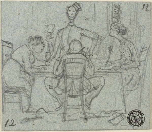 Editor: This is Charles Keene’s sketch, "Mr Punch," now held at the Tate. It’s a quick little thing, but the character in the middle, with that amazing nose, completely steals the show. What do you make of it? Curator: Keene's line is so wonderfully spontaneous, isn’t it? It’s like catching a fleeting thought. Look at how he captures the theatricality of Punch, even in repose. Do you think he pities Punch or sees himself in Punch? Editor: That’s a great question. I hadn’t considered the self-portrait angle. Curator: Perhaps it’s both. Perhaps it's neither! The beauty lies in the question, wouldn’t you agree? Editor: I would. It makes me want to learn more about Keene and Mr. Punch!