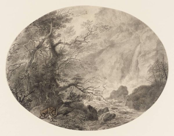 Editor: So, this is Johannes Franciscus Hoppenbrouwers' "Bosrand," dating roughly between 1829 and 1866. It's a watercolor and charcoal drawing currently held in the Rijksmuseum. The somber monochromatic palette gives it a wistful feeling. How do you read this work? Curator: What strikes me immediately is how the artist’s chosen medium shapes our perception. Watercolor and charcoal were readily available and relatively inexpensive, indicative of the democratization of art production during the 19th century. This wasn’t an oil painting for a wealthy patron, but an accessible scene crafted from commonplace materials. Consider the labor involved in producing charcoal itself – burning wood, a process deeply intertwined with human needs and industrial progress. Does the medium inform how we see the 'forest' depicted? Editor: That's interesting. I was mostly looking at the composition, with those striking trees. Are you suggesting the focus shouldn’t just be on what’s *depicted*? Curator: Precisely! Romanticism often idealized nature, but what happens when we shift our gaze from the idyllic representation to the very stuff it’s made of? The rough texture of the charcoal, the way the watercolor bleeds – these aren't just aesthetic choices, but clues about the artist’s process and relationship with the raw materials at hand. How does knowing this challenge the established 'high art' traditions? Editor: So, seeing this as charcoal and watercolor makes it less about a beautiful forest and more about…work, material availability, and changing social structures. Curator: Exactly. It reminds us that art isn’t born in a vacuum, but through labor, resources, and societal contexts. We can analyze its means of production, just like any other commodity. Editor: That gives me a lot to think about; I’d never really considered charcoal as having its own history! Curator: Likewise; this attention to materials also inspires reflection on our contemporary means of artistic and economic output.