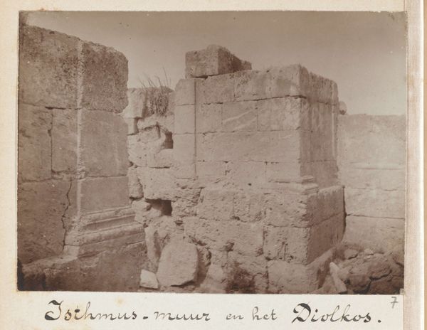 Curator: Here we have a photograph titled “Ruïne van de stadsmuur van Baalbek,” or "Ruins of the city wall of Baalbek," created by Félix Bonfils sometime between 1867 and 1877. Editor: What strikes me immediately is its solemnity. A stark, almost geometric arrangement of stone blocks, imbued with this melancholic sense of timeless decay. The image seems to exhale centuries. Curator: Bonfils captured a moment heavy with historical and cultural significance. Baalbek, also known as Heliopolis, was a crucial ancient city, its architecture reflecting a blend of Phoenician, Greek, and Roman influences. The city wall and the temple, represented by partial ruins, symbolize power and the passage of time. Editor: Exactly! It's a potent symbol—a sort of melancholic theater where history unfolds. But, the monochromatic palette lends a timeless quality, right? A quiet echo from an empire long vanished. The light itself seems to be telling stories. Curator: It's fascinating how those enormous, precisely cut stones echo megalithic building traditions found around the world. The city wall wasn't just about defense; it was also about visually representing dominance and order. The surviving portion whispers to the stories these civilizations left behind. Editor: Makes me think about the layers upon layers of stories these stones could tell. The idea that something so physically massive can still feel so… vulnerable is pretty fascinating. We see the physical reality of architectural ambitions eroded slowly by time. You can almost feel it under your own feet. Curator: And to understand this, the photographic medium adds another layer, documenting these grand designs from the past, capturing an epoch that already seemed remote, and also giving access to something only archeology unearths, carrying memory over time. It shows our universal story of how power rises and then invariably yields. Editor: It also captures this universal artistic tension between creating something to last forever, knowing very well that forever never really lasts. It feels more poignant knowing it’s caught by camera, and held suspended in a captured moment. Curator: An image that is like a stark meditation on mortality, both of structures and civilizations. Editor: Absolutely. A quiet moment of contemplation amidst colossal ruins. I think that says everything.