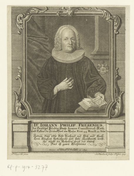 Editor: This is Pieter Tanjé’s "Portret van Maarten Luther," or Portrait of Martin Luther, an engraving from 1754 or 1755. It's incredibly detailed. What do you see in this piece, in terms of its historical impact or even its message about power? Curator: The very existence of this portrait speaks volumes about the evolving social and political landscape following the Reformation. Luther, once an antagonist to established power structures, is here memorialized. It’s vital to remember that depictions like these don't simply reflect reality; they actively construct narratives. Editor: So you're saying it’s not just about likeness? Curator: Precisely. Think about it: who commissioned this work? What purpose did it serve? How does the symbolism of the swan, for example, allude to Jan Hus and situate Luther within a specific lineage of religious reform and dissent? Also, what does it say about the canonization of his image, right? A once-radical figure now enshrined within a more academic framework? Editor: It's interesting how the portrait also reflects shifts in cultural attitudes towards religious authority. I suppose, the portrait also portrays something different, a new way of seeing things… Curator: Indeed. The portrait not only captures Luther’s likeness, but also the transformation of religious thought and expression in society. Considering these aspects makes us think critically about power, representation, and the legacies of individuals who challenged the status quo, right? Editor: I never considered the idea of portraiture as constructing and solidifying historical narratives before. That really broadens my understanding!