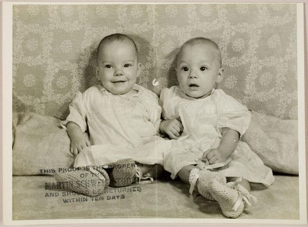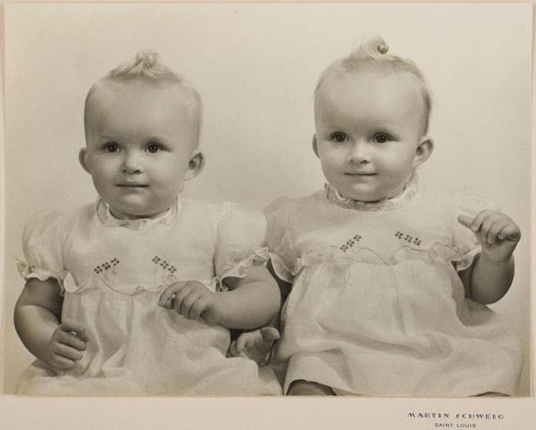 Curator: This black and white photograph, taken by Martin Schweig, presents two babies seated in a chair. The work is simply titled "Untitled (portrait of two babies sitting in chair)". Editor: The babies' expressions! They’re so serious, almost world-weary. It’s a tender yet slightly unsettling portrait. Curator: Infant portraiture held cultural significance. Images like this were often commissioned to mark milestones, demonstrating social standing and familial pride. Editor: The mirroring effect is potent. Two beings, almost identical, yet possessing distinct gazes. Are we meant to see the shared human condition, or individual destinies? Curator: The neutral background shifts focus to their faces, to their pure innocence. The white blanket, a symbol of purity and new beginnings. Editor: Knowing the history of studio portraiture, I wonder how much control the photographer really had. Were they posed this way or did they fall into this natural composition? Curator: It’s a glimpse into a past era of photographic conventions, a style intended to immortalize these children. Editor: Such a simple image, but it stirs a lot of questions about identity and the cultural weight we put on representations of childhood.