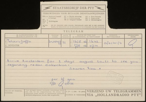 Editor: So, this is Richard Nicolaüs Roland Holst's "Telegram aan Willem Bogtman," likely from 1923. It’s a drawing, seemingly just ink on a pre-printed telegram form. It looks pretty simple, almost like ephemera, but the handwriting gives it a personal touch. What can you tell me about this work? Curator: Look closely at the telegram itself. It’s a mass-produced form, meant for quick communication, a tool of burgeoning capitalism. Holst, however, reclaims it. He’s not just sending information; he's imbuing the mundane with artistry, challenging the traditional hierarchy that elevates painting over "lowly" writing or document design. Editor: So, you're saying the medium itself is important? Curator: Absolutely. The pre-printed form represents standardized communication, almost dehumanized. Yet, Holst's handwritten message and signature disrupt this. What's fascinating is the tension created between mass production and individual expression. How do you think the specific act of writing, the labor of his hand, plays into this dynamic? Editor: It's a direct intervention! His hand subverts the industrial printing, adding an element of craft. And this act of transforming something so commonplace adds another layer to its meaning. Curator: Precisely! Consider also the implied network that made this telegram possible. The workers who printed the form, the operators who transmitted the message… all of this contributes to our understanding of Holst's seemingly simple act of communication. It’s a social document, hinting at a web of relationships and labor. Editor: That’s a really interesting point. I initially just saw a note, but thinking about the labor and systems involved, it gives me so much more to consider. Thanks for highlighting that. Curator: My pleasure. It’s important to remember that even the most humble materials can tell profound stories about production, society, and artistic intention.