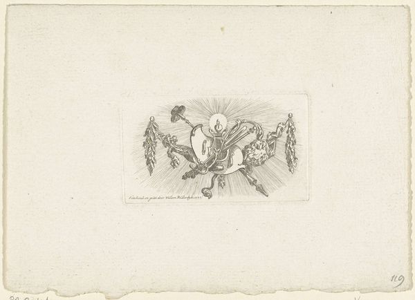Curator: Alright, let’s discuss this striking print: "Engel met bazuin op een wolk met boeken," or "Angel with Trumpet on a Cloud with Books," by Bernard Picart, dating from around 1715 to 1717. Editor: My immediate thought is that this cherubic figure, seemingly weightless on a cloud of ideas, seems a bit…stuffy? All those books and that rather serious expression, makes the trumpet feel more like an announcement of obligations than joy. Curator: Well, looking at it through a formalist lens, notice the allegorical structure, blending classical and baroque elements. The composition emphasizes the symbolic value of each element. Books for learning, the trumpet representing enlightenment. Editor: I get that! And I adore the engraving technique – so detailed yet ethereal! But artistically, does it really sing? It feels a little contrived. I think what is odd about the books is they act like steps or a platform - it just takes me away from feeling the lightness you might associate with an angel floating on clouds. Curator: Contrived? I think it's quite masterful. The contrast of light and shadow, created by Picart's skilled engraving, brings a dynamism that's hard to ignore. Each line has meaning in delineating form, particularly when considered from a semiotic perspective in considering how symbols reinforce meaning. Editor: I suppose so, the texture in the clouds *is* beautiful. The cross-hatching technique almost feels modern for its time, doesn’t it? I wonder, what sort of message was Picart aiming to transmit in a society ripe with scientific revolution? Curator: Maybe that the dissemination of knowledge comes with a divine pronouncement. What do you think that the use of allegory here suggests about the artist's worldview and societal values in the early 18th century? Editor: Hmmm... that the pursuit of knowledge is a celestial quest, but also one needing some serious effort given how grounded and book-heavy this angel appears! This discussion does make me see more of the piece's intentionality.