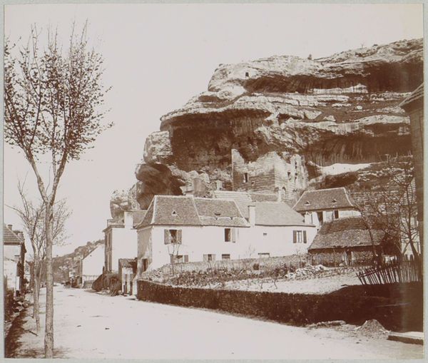 Curator: Standing before us is a gelatin silver print titled “Gezicht op huizen en rotswand van Les Eyzies-de-Tayac-Sireuil,” created in 1904. The photographer behind this evocative image is simply known as Delizy. Editor: My immediate sense is of dwarfed existence against the weight of ages. These houses snuggled against that monolithic rock face give the impression that time itself is a geological force, pressing down on the inhabitants. Curator: Precisely! The photograph beautifully juxtaposes the permanence of nature against human dwellings, and the sepia tones enhance the timeless feel. Note the deliberate composition. The winding road guides the eye up to the village nested at the foot of the cliff. Editor: The very idea of “nestled” speaks to a sense of shelter but I also sense an implicit vulnerability in the presence of that overwhelming natural mass behind those habitations. The light almost seems to accentuate this interplay between security and precarity. The composition almost hints at narrative! Curator: Absolutely! The light, you mentioned, subtly carves out forms in the stone. Delizy's use of photography as a medium provides a snapshot, literally and figuratively, of the evolving dialogue between mankind and landscape, a visual poetics influenced by Post-Impressionism. The photographer finds that sweet spot between the realist and the impressionistic tendencies of his day! Editor: And that brings to mind something critical here - it is a photograph. This could've easily been a study in realism. Instead, the photograph infuses a sense of post-impressionistic sensibilities of what reality looks like. Almost hinting, but not telling. Curator: Well said! It seems as though this piece, in many ways, is a silent discourse concerning that inherent duality that characterizes human's place within the environment. This singular frame contains all. Editor: It certainly encapsulates an age-old tension with striking immediacy. This singular artwork almost invites the spectator to step in to the scene and ask its tenants about this co-existence. Curator: A perfectly apt description! I encourage you now, to contemplate further the quiet story being told within the composition.