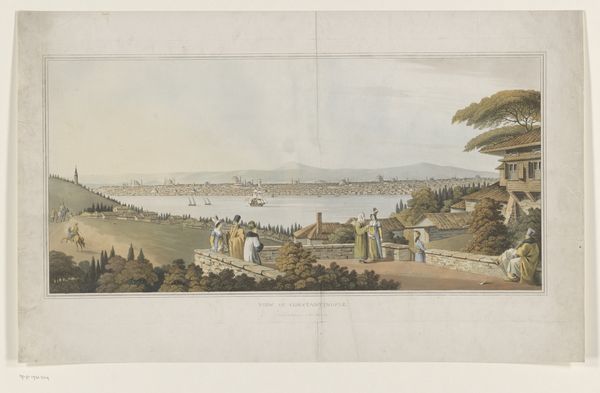 Curator: And here we have "The Town of Perth," an undated print by John Heaviside Clark. It's rendered as an etching, and delicately hand-colored. Editor: It has this gorgeous, wistful quality. The colors are so soft; it’s like looking through a dream. You immediately want to relax on that grassy knoll with those stylishly-dressed folks, doesn't it? Curator: Absolutely, it’s an exercise in picturesque composition, framing the distant town with the meandering river Earn. Note how Clark contrasts the carefully ordered town with the gently wild foreground. The balance almost seems deliberate. Editor: It feels almost theatrical. The high vantage point, the stage-like foreground populated with figures in vignettes—lovers reclining, families strolling—it all constructs an image of idyllic leisure. Though it makes me wonder, is it truthful? Was life actually this pastoral? Curator: Likely idealized. Clark was catering to a specific market that wanted to imagine the country and town in this light, which can be seen in his calculated arrangement. Consider the way the light softly hits specific areas—highlighting a group of strollers or a distant building to give the work depth and focus. Editor: Those light washes add another layer of interest. Despite the crispness afforded by the etching, the color lends a subtle emotional touch, softening harsh edges. Curator: Right! And the placement of the human figure invites us to project ourselves into the scene; it allows us to think we could walk in to it! It's so inviting, yet somehow distant...a perfected version of life. Editor: Precisely! The romantic in me sighs, and the realist acknowledges the stagecraft. Thanks, John Heaviside Clark, for both the dream and the gentle nudge back to earth! Curator: It’s in this contrast, I think, that the work holds its magic and historical importance. A look into not just the past but how people in the past *wanted* to see the past, the world, or simply the possibilities before them.