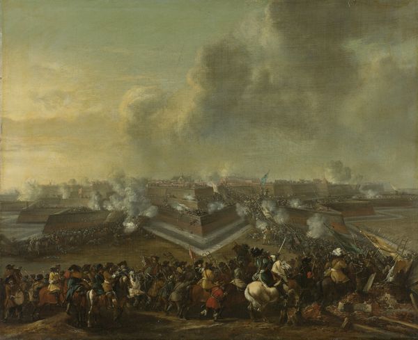 Curator: Here we have Jan van Huchtenburg's monumental "The Battle of Ramillies," painted sometime between 1706 and 1710. It's such a whirlwind of activity depicted in oil. Editor: My initial sense is controlled chaos. There's a vast landscape that draws the eye to a distant point, but the immediate foreground is packed with figures and horses in dynamic disarray. Curator: Absolutely. As a Baroque battle scene, it’s packed with symbolism of power, the dynamic horses embodying strength, but I see it more about capturing a historical moment and, naturally, memorializing the victorious. The symbols get twisted a little by all the commotion. Editor: Yes, and those fallen soldiers are key symbols too, reflecting sacrifice. There are moments where I feel that sacrifice in a romantic sense. But the light and the dramatic sky do bring this air of almost celebratory triumph, don’t you think? Even the dark tones create a theatrical, emotive field. It really speaks to memory. Curator: Huchtenburg used the painting, and its dramatic style, to shape that memory, and there is something idealized, something removed from the harsh reality of warfare in the execution here. Though he’s painted incredible motion, I still feel somewhat detached from any actual visceral feeling of war. Editor: I agree. I feel a need to reconcile the almost operatic presentation with what I know to be its context: immense violence. It's an unsettling dance between history and romanticized depiction, between raw emotion and cultural conditioning. Curator: It's a fascinating painting that brings history alive, even if the version of that life has been artfully tailored. Editor: Indeed. And for me, that friction between historical document and symbolic expression is where its enduring power resides.