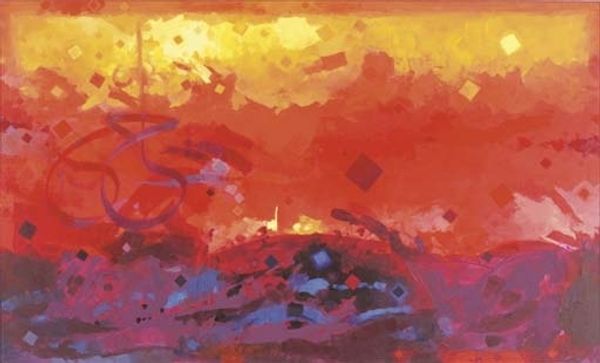 Abdul Qader Al Raes created "Bishra," or "Announcement," using fluid strokes of paint that blend abstraction with Arabic calligraphy. The process begins with stretched canvas, an industrial product that’s become a standard support for painting globally. Al Raes then uses brushes to apply layers of acrylic paint, building up the surface with vibrant color. The loose, gestural strokes capture a sense of spontaneity, yet reveal the artist's skillful control of the medium. Look closely, and you will notice how the fluid application creates a sense of depth, with the Arabic script emerging from a ground of blended hues. Al Raes skillfully marries traditional calligraphic forms with contemporary painting techniques. In doing so, he invites us to consider how making processes can bridge cultural heritage with modern modes of expression. By focusing on materials, methods, and context, we recognize the complex intersections between art, craft, and globalized production.