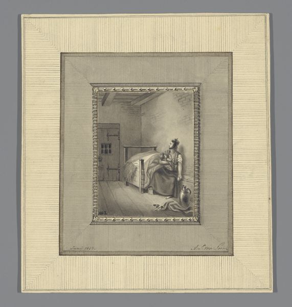Curator: A hush seems to fall over me when I gaze upon this piece; a Fotoreproductie van schilderij by Albert Neuhuys, believed to have been crafted somewhere between 1850 and 1900. What do you sense upon viewing it? Editor: Well, that quietude is certainly in there. It's almost like peering into a memory, isn’t it? All faded browns and gentle strokes; a scene of domestic tranquility rendered with… perhaps unintentional fragility? Curator: Fragility, that's potent! Made from mixed media – a combination of watercolor, drawing, and coloured pencil. Look closer— do you see how he outlines these simple women inside a bare house? It’s just humming along. I wonder what it was like there. Editor: Absolutely, and the tonal range is exquisite! Notice how the darker hues anchor the subjects within the room while the lighter washes suggest the passage of light through the window. Compositionally, the interior becomes a stage, framing this quiet narrative so precisely. Curator: It really brings to mind genre-painting with all its simple glory. It does make you wonder, though, who the women are. There is such intimacy in the shared labor of needlework or simple tasks— perhaps some hidden significance is held between them. Editor: Certainly a possibility! But observe: even absent contextual knowledge, one can decode the image through its own internal language. The careful detailing, the interplay of light and shadow, all point toward the universality of the moment. It's about feeling connected. Curator: Ah yes, how space and intention are held to task is, itself, an observation! When viewing this quiet drawing that seems both delicate and profound, my imagination takes wing—to dwell alongside Albert Neuhuys. Editor: Mine is tethered by what's directly apparent, that intimate, structural integrity, the sheer visual weight afforded to a moment that could otherwise dissolve unnoticed! A rather remarkable thing!