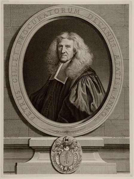 Curator: Up next, we have a piece from 1681. It's a work by Anthony van Zijlvelt, titled "Portret van Herman Witsius". Editor: It's intense, isn't it? Stark, like a chiseled thought rendered in greyscale. The fine lines suggest immense labor. What medium are we looking at? Curator: This is an engraving, so that gives us some insight into the tools at play here, the metal plates, the acids... It speaks to craft, doesn't it? You can almost feel the labor invested, the hand guiding the tool. Editor: Absolutely, the level of detail is fascinating when you think of the reproductive process involved. Look at how van Zijlvelt captures the texture of the hair, almost like delicate wire, or the velvet-like quality of Witsius’ robes. I wonder, what are your thoughts on its composition? It's so... oval. Curator: (chuckles) Yes, the oval frames a man confined by dogma, literally. Yet, there's also something profoundly human in Witsius’ eyes—a spark of doubt, or perhaps weariness. It's the Baroque's fascination with internal struggles laid bare for all to see. That text in the lower half of the picture tells its own tale as well; it really frames Witsius. Editor: True. That inscribed pedestal grounds the portrait, literally giving him weight. The Latin text adds another layer. How does it strike you? Is it all pure flattery? Curator: Well, of course there’s an element of flattery—he was, after all, a celebrated professor of theology. But the verse also seems to acknowledge his immense learning and influence, presenting him almost as a philosophical king. And as this work clearly suggests the printing trade, we need to take into consideration the labor invested in such efforts of portraiture and inscription and book making at the time. What an industry! Editor: Precisely. Seeing all the individual manual inputs provides a nice point of reference for those of us existing within contemporary modes of production and distribution of images. Food for thought! Curator: Yes, a wonderful reminder of how even something seemingly straightforward can reveal deeper stories about creativity, society, and the enduring human quest for meaning.