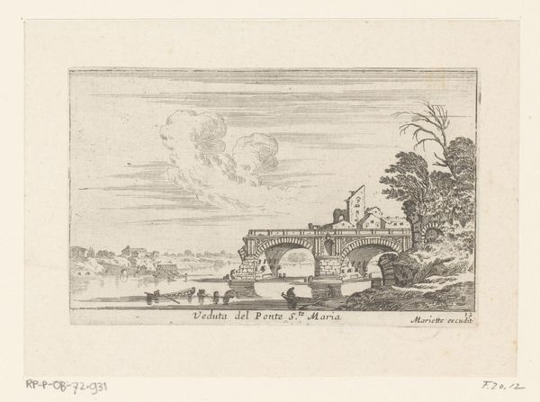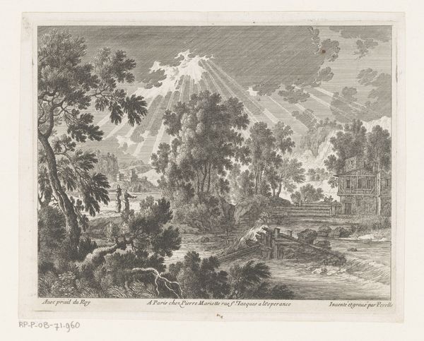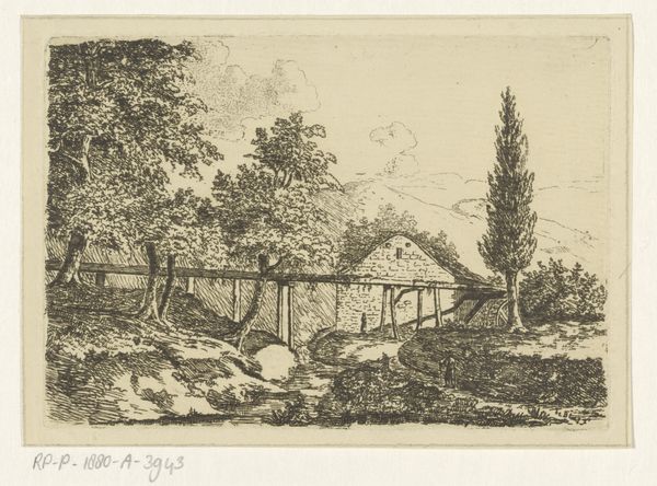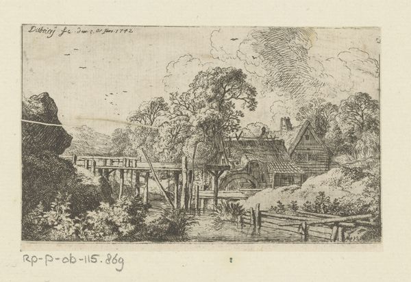 Curator: So, here we have Christian Wilhelm Ernst Dietrich's "Landscape with Watermill by the River," an etching from 1742 currently residing at the Rijksmuseum. It's a prime example of Baroque landscape art. Editor: You know, even in monochrome, I get a real sense of warmth from this. There’s a kind of quiet, pastoral bliss radiating from that little watermill. Curator: Absolutely. Note how Dietrich uses tightly controlled hatching and cross-hatching to build up the tonal range. The textural contrasts between the foliage, the water, and the rough stone of the mill are quite compelling. Consider how that complex layering invites the viewer's gaze to linger. Editor: I'm almost feeling the urge to grab a fishing rod and waste a summer afternoon by that river. There is some skillful rendering that is true, and you can see every twig. But it's the overall effect, not the detail that draws me in. Almost like a hazy memory of some place I knew long ago. It is peaceful in my memory. Curator: A productive response. But can we decode the composition? The bridge on the left, balanced against the mass of the watermill on the right creates an asymmetric equilibrium. Notice that the negative space within the architecture of the mill gives a focal point, further reinforcing this tension. The semiotic construction serves to structure the pictorial space. Editor: Well, if you put it that way… It’s funny, isn't it, how something so structured and controlled can still feel so natural, so spontaneous? The mind loves order, but I have always leaned more toward the natural wonder. Is art even real to anyone when it is completely without that sense of "discovery?" Curator: The artistry of Dietrich resides in his meticulous technique to mimic nature; this "realness" is not happenstance. Every stroke has intent to conform with Baroque aesthetic principles which emphasize symmetry, order, and clear narrative structure. These conventions aim not to simply replicate reality but to elevate it to convey moral and symbolic meaning. Editor: Right, right, but it also feels, on some level, like a stage set, or an illustration in some forgotten fable. Regardless, the image sticks, and the details emerge even more each time I give it another look. Thanks for pointing that out. Curator: My pleasure. This exploration reminds us of the profound layers of meaning and skill embedded within the deceptively simple imagery of the etching.